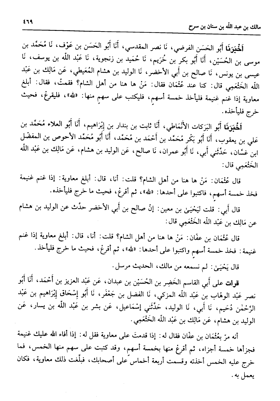 أخبرنا أبو الحسن الفرضي نا نصر المقدسي أنا أبو الحسن بن عوف نا محمد بن موسى بن الحسين أنا أبو بكر بن خريم نا حميد بن زنجوية نا عبد الله بن يوسف نا عيسى بن يونس نا صالح بن أبي الأخضر نا الوليد بن هشام المعيطي عن مالك بن عبد الله الخثعمي قال كنا عند عثمان فقال من هاهنا من أهل لاشام فقمت فقال أبلغ معاوية إذا غنم غنيمة فليأخذ خمسة أسهم فليكتب على سهم منها لله فليقرع فحيث خرج فليأخذه أخبرنا أبو البركات الأنماطي أنا ثابت بن بندار بن إبراهيم أنا أبو العلاء محمد بن علي بن يعقوب أنا أبو بكر محمد بن أحمد بن محمد أنا أبو محمد الأحوص بن المفضل ابن غسان حدثني أبي نا أبو عمران نا صالح عن الوليد بن هشام عن مالك بن عبد الله الخثعمي قال قال عثمان من هاهنا من أهل الشام قلت أنا قال أبلغ معاوية إذا غنم غنيمة فخذ خمسة أسهم فاكتبوا على أحدها لله ثم أقرع فحيث ما خرج فليأخذه قال أبي قلت ليحيى بن معين إن صالح بن أبيي الأخضر حدث عن الوليد بن هشام عن مالك بن عبد الله الخثعمي قال قال عثمان بن عفان من هاهنا من أهل الشام قلت أنا قال أبلغ معاوية إذا غنم غنيمة فخذ خمسة أسهم واكتبوا على أحدها لله ثم أقرع فحيث ما خرج فليأخذ قال يحيى لم نسمعه من مالك الحديث مرسل قرأت على أبي القاسم الخضر بن الحسين بن عبدان عن عبد العزيز بن أحمد أنا أبو نصر عبد الوهاب بن عبد الله المزكي نا الفضل بن جعفر نا أبو إسحاق إبراهيم بن عبد الرحمن دحيم نا أبي نا الوليد حدثني إسماعيل عن بشر بن عبد الله بن يسار عن الوليد بن هشام عن مالك بن عبد الله الخثعمي أنه مر بعثمان بن عفان فقال له إذا قدمت على معاوية فقل له إذا أفاء الله عليك غنيمة فجزأها خمسة أجزاء ثم أقرع منها بخمسة أسهم وقد كتبت على سهم منها الخمس فما خرج عليه الخمس أخذته وقسمت أربعة أخماس على أصحابك فبلغت ذلك معاوية فكان يعمل به