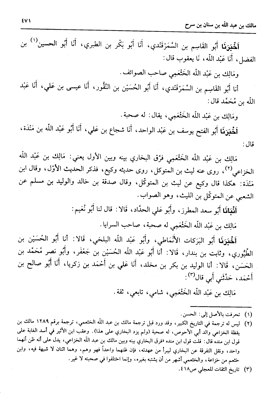 أخبرنا أبو القاسم بن السمرقندي أنا أبو بكر بن الطبري أنا أبو الحسين (1) بن الفضل أنا عبد الله نا يعقوب قال ومالك بن عبد الله الخثعمي صاحب الصوائف أنا أبو القاسم بن السمرقندي أنا أبو الحسين بن النقور أنا عيسى بن علي أنا عبد الله بن محمد قال ومالك بن عبد الله الخثعمي يقال له صحبة أخبرنا أبو الفتح يوسف بن عبد الواحد أنا شجاع بن علي أنا أبو عبد الله بن مندة قال مالك بن عبد الله الخثعمي فرق البخاري بينه وبين الأول يعني مالك بن عبد الله الخزاعي (2) روى عنه ليث بن المتوكل روى حديثه وكيع فذكر الحديث الأول وقال ابن مندة هكذا قال وكيع عن ليث بن المتوكل وقال صدقة بن خالد والوليد بن مسلم عن الشعبي المتوكل بن الليث وهو الصواب أنبأنا أبو سعد المطرز وأبو علي الحداد قالا قال لنا أبو نعيم مالك بن عبد الله الخثعمي له صحبة صاحب السرايا أخبرنا أبو البركات الأنماطي وأبو عبد الله البلخي قالا أنا أبو الحسين بن الطيوري وثابت بن بندار قالا أنا أبو عبد الله الحسين بن جعفر وأبو نصر محمد بن الحسن قالا أنا الوليد بن بكر بن مخلد أن علي بن أحمد بن زكريا أنا أبو صالح بن أحمد حدثني أبي قال (3) مالك بن عبد الله الخثعمي شامي تابعي ثقة