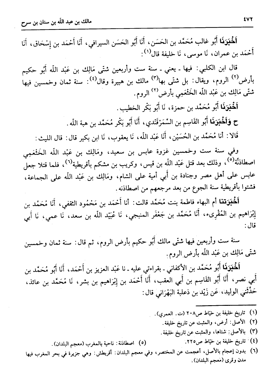 أخبرنا أبو غالب محمد بن الحسن أنا أبو الحسن السيرافي أنا أحمد بن إسحاق أنا أحمد بن عمران نا موسى نا خليفة قال (1) قال ابن الكلبي فيها يعني سنة ست وأربعين شتى مالك بن عبد الله أبو حكيم بأرض (2) الروم ويقال بل شتى بها (3) مالك بن هبيرة وقال (4) سنة ثمان وخمسين فيها شتى مالك بن عن الله الخثعمي بأرض (2) الروم أخبرنا أبو محمد بن حمزة نا أبو بكر الخطيب [* * * *] وأخبرنا أبو القاسم بن السمرقندي أنا أبو بكر محمد بن هبة الله قالا أنا محمد بن الحسين أنا عبد الله نا يعقوب نا ابن بكير قال قال الليث وفي سنة ست وخمسين غزوة عابس بن سعيد ومالك بن عبد الله الخثعمي اصطاذنه (5) وذلك بعد قتل عبد الله بن قيس وكريب بن مشكم بأقريطية (6) فلما قتلا جعل عابس على أهل مصر وجنادة بن أبي أمية على الشام ومالك بن عبد الله على الجماعة فشتوا بأقريطية سنة الجوع من بعد مرجعهم من اصطاذنه أخبرتنا أم البهاء فاطمة بنت محمد قالت أنا أحمد بن محمود الثقفي أنا محمد بن إبراهيم المقرئ أنا محمد بن جعفر المنبجي نا عبيد الله بن سعد نا عمي نا أبي قال سنة ست وأربعين فيها شتى مالك أبو حكيم بأرض الروم ثم قال سنة ثمان وخمسين شتى مالك بن عبد الله بأرض الروم أخبرنا أبو محمد بن الأكفاني بقراءتي عليه نا عبد العزيز بن أحمد أنا أبو محمد بن أبي نصر أنا أبو القاسم بن أبي العقب أنا أحمد بن إبراهيم بن بشر نا محمد بن عائذ حدثني الوليد عن زيد بن ذعلبة البهراني قال