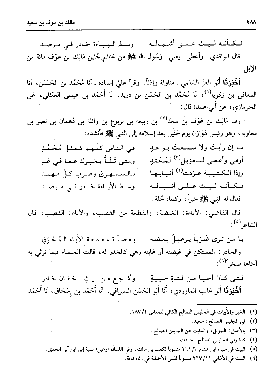 فكأنه ليث على أشباله * وسط الهباءة خادر في مرصد * قال الواقدي وأعطى يعني رسول الله (صلى الله عليه وسلم) من غنائم حنين مالك بن عوف مائة من الإبل أخبرنا أبو العز السلمي مناولة وإذنا وقرأ علي إسناده أنا محمد بن الحسين أنا المعافى بن زكريا (1) نا محمد بن الحسن بن دريد نا أحمد بن عيسى العكلي عن الحرمازي عن أبي عبيدة قال وفد مالك بن عوف بن سعد (2) بن ربيعة بين ربوع بن وائلة بن دهمان بن نصر بن معاوية وهو رئيس هوازن يوم حنين بعد إسلامه إلى النبي (صلى الله عليه وسلم) فأنشده * ما إن رأيت ولا سمعت به * في الناس كلهم كمثل محمد أوفى وأعطى للجزيل (3) لمجتد * ومتى تشأ يخبرك عما في غد وإذا الكتيبة عردت (4) أنيابها * بالسمهري وضرب كل مهند فكأنه ليث على أشباله * وسط الهباءة خادر في مرصد * فقال له النبي (صلى الله عليه وسلم) خيرا وكساه قال القاضي الأباءة الغيضة والقطعة من القصب والأباء القصب قال الشاعر (5) * يامن ترى ضربا يرعبل بعضه * بعضا كمعمعة الأباء المحرق * والخادر المستكن في غيضته أو غابته وهي كالخدر له قالت الخنساء فيما ترثي به أخاها صخرا (6) * فتى كان أحيا من فتاة حيية * وأشجع من ليث بخفان خادر * أخبرنا أبو غالب الماوردي أنا أبو الحسن السيرافي أنا أحمد بن إسحاق نا أحمد