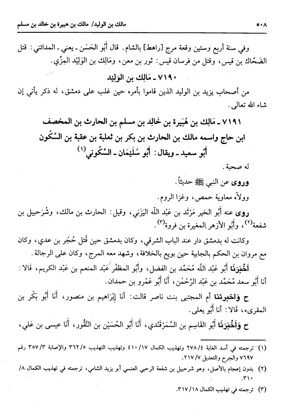 7191 - مالك بن هبيرة بن خالد بن مسلم بن الحارث بن المخصف ابن حاج واسمه مالك بن الحارث بن بكر بن ثعلبة بن عقبة بن السكون أبو سعيد ويقال أبو سليمان السكوني (1) له صحبة وروى عن النبي (صلى الله عليه وسلم) حديثا وولاه معاوية حمص وغزا الروم روى عنه أبو الخير مرثد بن عبد الله اليزني وقيل الحارث بن مالك وشرحبيل بن شفعة (2) وأبو الأزهر المغيرة بن فروة (3) وكانت له بدمشق دار عند الباب الشرقي وكان بدمشق حين قتل حجر بن عدي وكان مع مروان بن الحكم بالجابية حين بويع بالخلافة وشهد معه المرج وكان على الرجالة أخبرنا أبو عبد الله محمد بن الفضل وأبو المظفر عبد المنعم بن عبد الكريم قالا أنا أبو سعد محمد بن عبد الرحمن أنا أبو عمرو بن حمدان وأخبرنا أم المجتبى بنت ناصر قالت أنا إبراهيم بن منصور أنا أبو بكر بن المقرئ قالا أنا أبو يعلى وأخبرنا أبو القاسم بن السمرقندي أنا أبو الحسين بن النقور أنا عيسى بن علي
