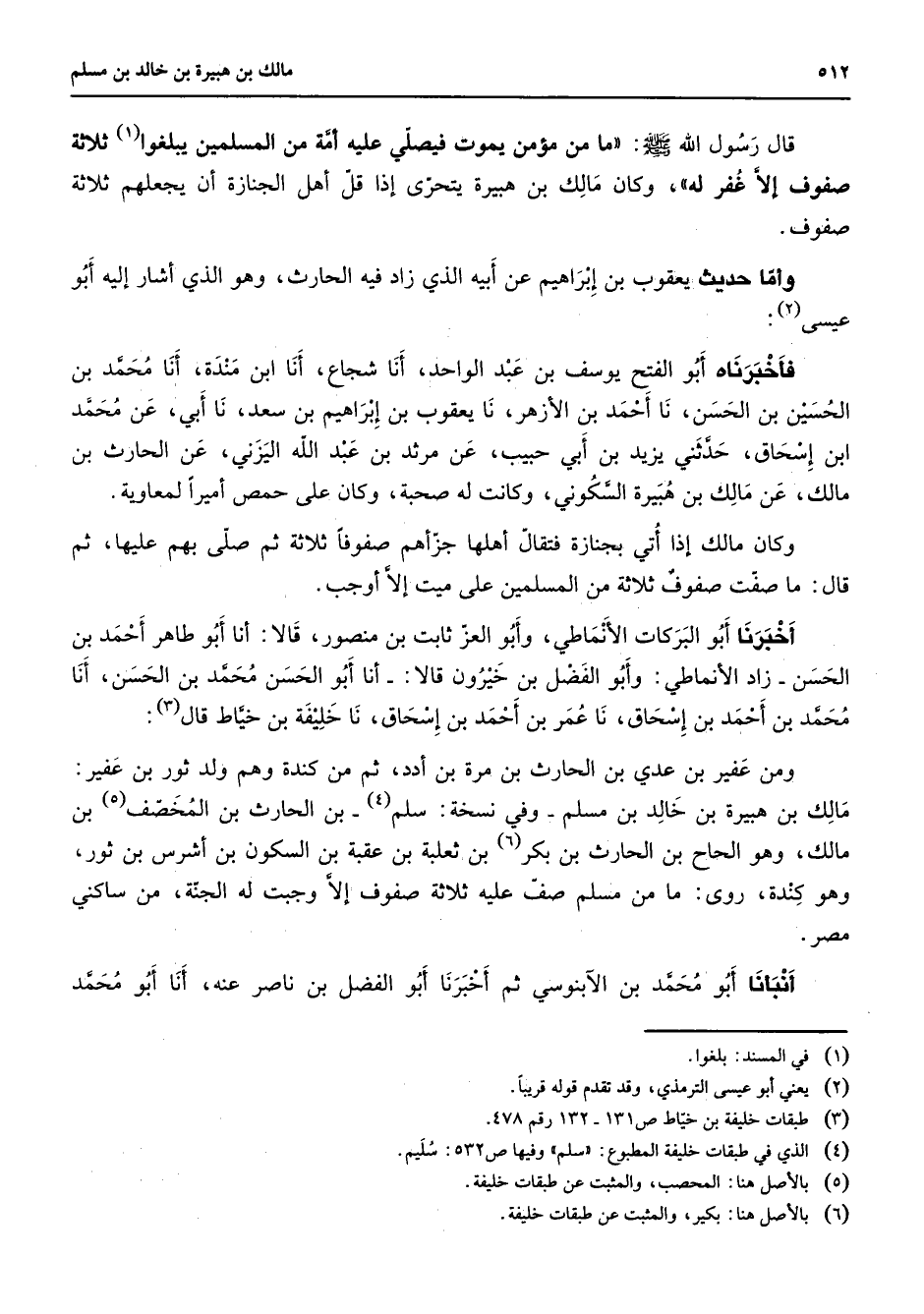 قال رسول الله (صلى الله عليه وسلم) ما من مؤمن يموت فيصلي عليه أمة من المسلمين يبلغو (1) ثلاثة صفوف إلا غفر له وان مالك بن هبيرة يتحرى إذا قل أهل الجنازة أن يجعلهم ثلاثة صفوف وأما حديث يعقوب بن إبراهيم عن أبيه الذي زاد يه الحارث وهو الذي اشار إليه أبو عيسى (2) فأخبرناه أبو الفتح يوسف بن عبد الواحد أنا شجاع أنا ابن مندة أنا محمد بن الحسين بن الحسن نا أحمد بن الأزهر نا يعقوب بن إبراهيم بن سعد نا أبي عن محمد ابن إسحاق حدثني يزيد بن ابي حبيب عن مرثد بن عبد الله اليزني عن الحارث بن مالك عن مالك بن هبيرة السكوني وكانت له صحبة وكان على حمص أميرا لمعاوية وكان مالك إذا أتي بجنازة فتقال أهلها جزأهم صفوفا ثلاثة ثم صلى بهم عليها ثم قال ما صفت صفوف ثلاثة من المسلمين على ميت إلى أوجب أخبرنا أبو البركات الأنماطي وأبو العز ثابت بن منصور قالا أنا أبو طاهر احمد بن الحسن زاد الأنماطي وأبو الفضل بن خيرون قالا أنا أبو الحسن محمد بن الحسن أنا محمد بن أحمد بن إسحاق نا عمر بن أحمد بن إسحاق نا خليفة بن خياط (3) قال ومن عفير بن عدي بن الحارث بن مرة بن أدد ثم من كندة وهم ولد ثور بن عفير مالك بن هبيرة بن خالد بن مسلم وفي نسخة سلم (4) بن الحارث بن المخصف (5) بن مالك وهو الحاح بن الحارث بن بكر (6) بن ثعلبة بن عقبة بن السكون بن أشرس بن ثور وهو كندة روى ما من مسلم صف عليه ثلاثة صفوف إلا وجبت له الجنة من ساكني مصر أنبأنا أبو محمد بن الآبنوسي ثم أخبرنا أبو الفضل بن ناصر عنه أنا أبو محمد