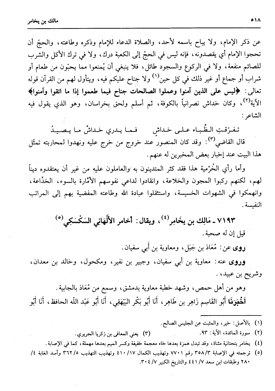 7193 - مالك بن يخامر (4) ويقال أخامر الألهاني السكسكي (5) قيل إن له صحبة روى عن معاذ بن جبل ومعاوية بن أبي سفيان وروى عنه معاوية بن أبي سفيان وجبير بن نفير ومكحول وخالد بن معدان وشريح بن عبيد وهو من أهل حمص وشهد خطبة معاوية بدمشق وسمع من معاذ بالجابية أخبرنا أبو القاسم زاهر بن طاهر أنا أبو بكر البيهقي أنا أبو عبد الله الحافظ أنا أبو