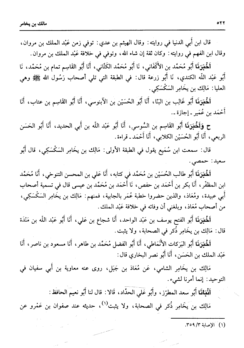 قال ابن أبي الدنيا في روايته وقال الهيثم بن عدي توفي زمن عبد الملك بن مروان وقال ابن الفهم في روايته وكان ثقة إن شاء الله وتوفي في خلافة عبد الملك بن مروان أخبرنا أبو محمد بن الأكفاني نا أبو محمد الكتاني أنا أبو القاسم تمام بن محمد نا أبو عبد الله الكندي نا أبو زرعة قال في الطبقة التي تلي أصحاب رسول الله (صلى الله عليه وسلم) وهي العليا مالك بن يخامر السكسكي أخبرنا أبو غالب بن البنا أنا أبو الحسين بن الآبنوسي أنا أبو القاسم بن عتاب أنا أحمد بن عمير إجازة وأخبرنا أبو القاسم بن السوسي أنا أبو عبد الله بن أبي الحديد أنا أبو الحسن الربعي أنا أبو الحسين الكلابي أنا أحمد قراء قال سمعت ابن سميع يقول في الطبقة الأولى مالك بن يخامر السكسكي قال أبو سعيد حمصي أخبرنا أبو طالب الحسين بن محمد في كتابه أنا علي بن المحسين التنوخي أنا محمد ابن المظفر أنا بكر بن أحمد بن حفص نا أحمد بن محمد بن عيسى قال في تسمية أصحاب أبي عبيدة ومعاذ والذين حضروا خطبة عمر بالجابية فمنهم مالك بن يخامر السكسكي من أصحاب معاذ وبلغني أن وفاته في خلافة عبد الملك أخبرنا أبو الفتح يوسف بن عبد الواحد أنا شجاع بن علي أنا أبو عبد الله بن مندة قال مالك بن يخامر ذكر في الصحابة ولا يثبت أخبرنا أبو البركات الأنماطي أنا أبو الفضل محمد بن طاهر أنا مسعود بن ناصر أنا عبد الملك بن الحسن أنا أبو نصر البخاري قال مالك بن يخامر الشامي عن معاذ بن جبل روى عنه معاوية بن أبي سفيان في التوحيد إنما أمرنا لشئ أنبأنا أبو سعد المطرز وأبو علي الحداد قالا قال لنا أبو نعيم الحافظ مالك بن يخامر ذكر في الصحابة ولا يثبت (1) حديثه عند صفوان بن عمرو عن