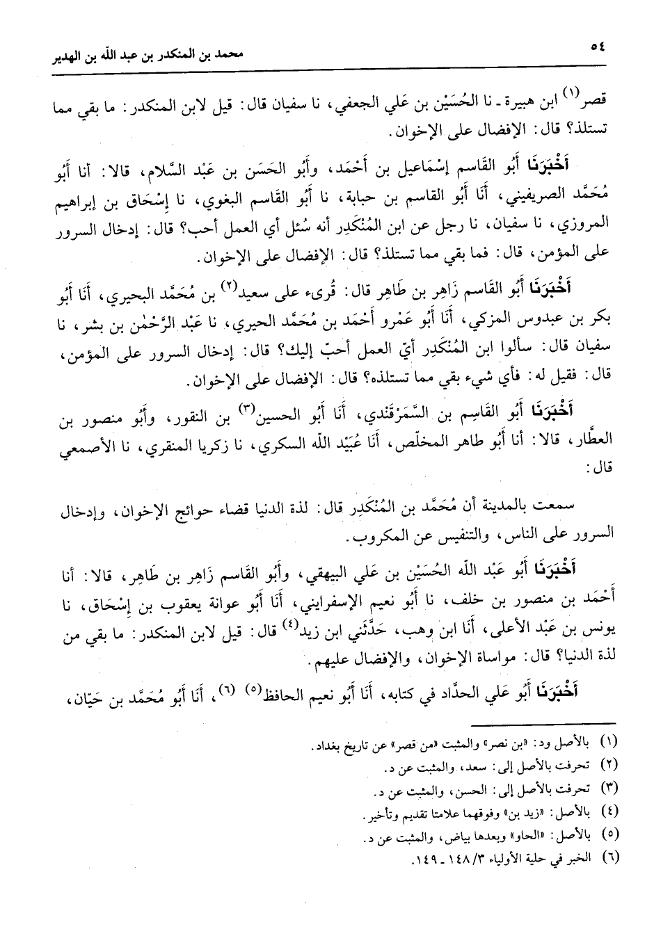 قصر ابن هبيرة نا الحسين بن علي الجعفي نا سفيان قال قيل لابن المنكدر ما بقي مما تستلذ قال الإفضال على الإخوان أخبرنا أبو القاسم إسماعيل بن أحمد وأبو الحسن بن عبد السلام قالا أنا أبو محمد الصريفيني أنا أبو القاسم بن حبابة نا أبو القاسم البغوي نا إسحاق بن إبراهيم المروزي نا سفيان نا رجل عن ابن المنكدر أنه سئل أي العمل أحب قال إدخال السرور على المؤمن قال فما بقي مما تستلذ قال الإفضال على الإخوان أخبرنا أبو القاسم زاهر بن طاهر قال قرئ على سعيد بن محمد البحيري أنا أبو بكر بن عبدوس المزكي أنا أبو عمرو أحمد بن محمد الحيري نا عبد الرحمن بن بشر نا سفيان قال سألوا ابن المنكدر أي العمل أحب إليك قال إدخال السرور على المؤمن قال فقيل له فأي شئ بقي مما تستلذه قال الإفضال على الإخوان أخبرنا أبو القاسم بن السمرقندي أنا أبو الحسين بن النقور وأبو منصور بن العطار قالا أنا أبو طاهر المخلص أنا عبيد الله السكري نا زكريا المنقري نا الأصمعي قال سمعت بالمدينة أن محمد بن المنكدر قال لذة قضاء حوائج الإخوان وإدخال السرور على الناس والتنفيس عن المكروب أخبرنا أبو عبد الله الحسين بن علي البيهقي وأبو القاسم زاهر بن طاهر قالا أنا أحمد بن منصور بن خلف نا أبو نعيم الإسفرايني أنا أبو عوانة يعقوب بن إسحاق نا يونس بن عبد الأعلى أنا ابن وهب حدثني ابن زيد قال قيل لابن المنكدر ما بقي من لذة الدنيا قال مواساة الإخوان والإفضال عليهم أخبرنا أبو علي الحداد في كتابه أنا أبو نعيم الحافظ أنا أبو محمد بن حيان