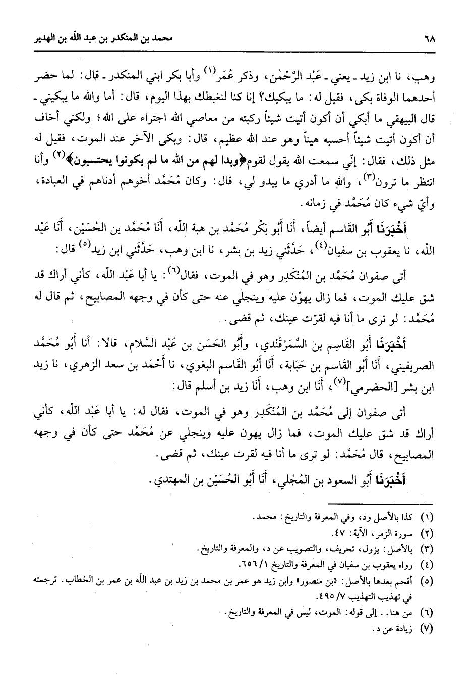 وهب نا ابن زيد يعني عبد الرحمن وذكر عمر (1) وأبا بكر ابني المنكدر قال لما حضر أحدهما الوفاة بكى فقيل له ما يبكيك إنا كنا لنغبطك بهذا اليوم قال أما والله ما يبكيني قال البيهقي ما أبكي أن أكون أتيت شيئا ركبته من معاصي الله اجتراء على الله ولكني أخاف أن أكون أتيت شيئا أحسبه هيناوهو عند الله عظيم قال وبكى الآخر عند الموت فقيل له مثل ذلك فقال إني سمعت الله يقول لقوم " وبدا لهم من الله ما لم يكونوا يحتسبون " وأنا انتظر ما ترون (3) والله ما أدري ما يبدو لي قال وكان محمد أخوهم أدناهم في العبادة وأي شئ كان محمد في زمانه أخبرنا أبو القاسم أيضا أنا أبو بكر محمد بن هبة الله أنا محمد بن الحسين أنا عبد الله نا يعقوب بن سفيان (4) حدثني زيد بن بشر نا أبو وهب حدثني ابن زيد (5) قال أتى صفوان محمد بن المنكدر وهو في الموت فقال يا أبا عبد الله كأني أراك قد شق عليك الموت فما زال يهون عليه وينجلي عنه حتى كأن في وجهه المصابيح ثم قال له محمد لو ترى ما أنا فيه لقرت عينك ثم قضى أخبرنا أبو القاسم السمرقندي وابو الحسن بن عبد السلام قالا أنا أبو محمد الصريفيني أنا أبو القاسم بن حبابة أنا أبو القاسم البغوي نا أحمد بن سعد الزهري نا زيد ابن بشر الحضرمي (7) أنا ابن وهب أنا زيد بن أسلم قال أتى صفوان إلى محمد بن المنكدر وهو في الموت فقال له يا أبا عبد الله كأني أراك قد شق عليك الموت فما زال يهو عليه وينجلي عن محمد حتى كأن في وجهه المصابيح قال محمد لو ترى ما أنا فيه لقرت عينك ثم قضى أخبرنا أبو السعود بن المجلي أنا أبو الحسين بن المهتدي