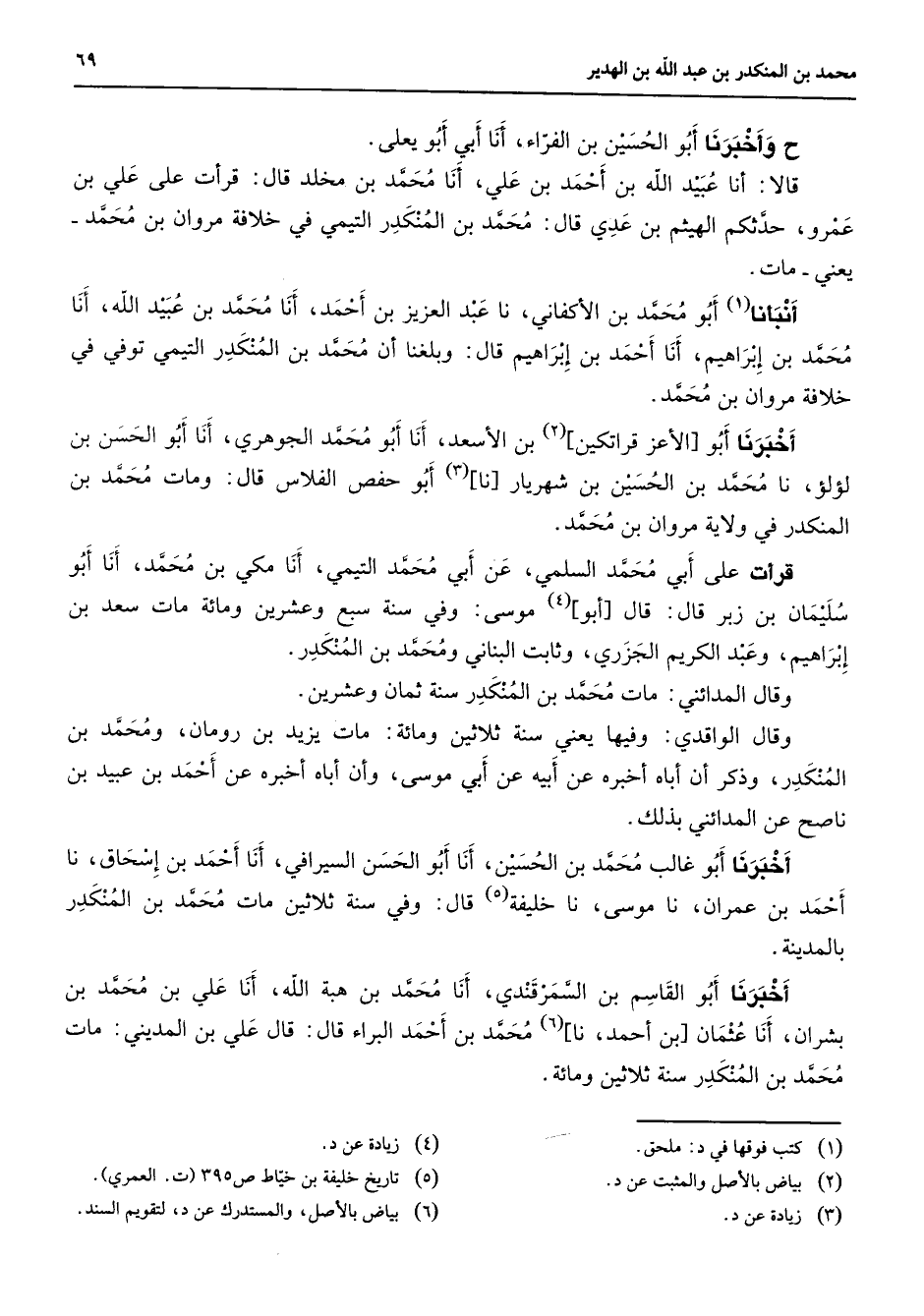 وأخبرنا أبو الحسين ابن الفراء أنا ابي أبو يعلى قالا أنا عبيد الله بن أحمد بن علي أنا محمد بن مخلد قال قرأت على علي بن عمرو حدثكم الهيثم بن عدي قال محمد بن المنكدر التيمي في خلافة مروان بن محمد يعني مات أنبأنا (1) أبو محمد بن الأكفاني نا عبد العزيز بن أحمد أنا محمد بن عبيد الله أنا محمد بن إبراهيم أنا أحمد بن إبراهيم قال وبلغنا إن محمد بن المنكدر التيمي توفي في خلافة مروان بن محمد أخبرنا أبو الأعز قراتكين (2) بن الأسعد أنا أبو محمد الجوهري أنا أبو الحسن بن لؤلؤ نا محمد بن الحسين بن شهريار نا (3) أبو حفص الفلاس قال ومات محمد بن المنكدر في ولاية مروان بن محمد قرأت على أبي محمد السلمي عن أبي محمد التيمي أنا مكي بن محمد أنا أبو سليمان بن زبر قال قال أبو (4) موسى وفي سنة سبع وعشرين ومائة مات سعد بن إبراهيم وعبد الكريم الجزري وثابت البناني ومحمد بن المنكدر وقال المدائني مات محمد بن المنكدر سنة ثمان وعشرين وقال الواقدي وفيها يعني سنة ثلاثين ومائة مات يزيد بن رومان ومحمد بن المنكدر وذكر أن اباه أخبره عن ابيه عن أبي موسى وأن اباه أخبره عن أحمد بن عبيد بن ناصح عن المدائني بذلك أخبرنا أبو غالب محمد بن الحسين أنا أبو الحسن السيرافي أنا أحمد بن إسحاق نا أحمد بن عمران نا موسى نا خليفة (5) قال وفي سنة ثلاثين مات محمد بن المنكدر بالمدينة أخبرنا أبو القاسم بن السمرقندي أنا محمد بن هبة الله أنا علي بن محمد بن بشران أنا عثمان بن أحمد نا (6) محمد بن أحمد البراء قال قال علي بن المديني مات محمد بن المنكدر سنة ثلاثين ومائة