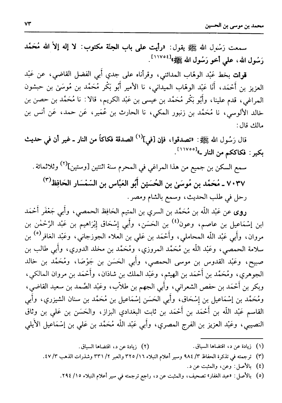 سمعت رسول الله (صلى الله عليه وسلم) يقول رأيت على باب الجنة مكتوب لا إله إلا الله محمد رسول الله على أخو رسول الله (صلى الله عليه وسلم) قرأت بخط عبد الوهاب المدائني وقرأناه على جدي أبي الفضل القاضي عن عبد العزيز بن أحمد أنا عبد الوهاب الميداني نا الأمير أبو بكر محمد بن موسى بن حبشون المراغي قدم علينا وأبو بكر محمد بن عيسى بن عبد الكريم قالا نا محمد بن حصن بن خالد الألوسي نا محمد بن زنبور المكي نا الحارث بن عمير عن حمد عن أنس بن مالك قال قال رسول الله (صلى الله عليه وسلم) تصدقوا فإن في (1) الصدقة فكاكا من النار غير أن في حديث بكير فكاككم من النار سمع السكن بن جميع من هذ المراغي في المحرم سنة اثنتين وستين (2) وثلاثمائة 7037 - محمد بن موسى بن الحسين أبا العباس بن السمسار الحافظ (3) رحل في طلب الحديث وسمع بالشام ومصر روى عن عبد الله بن محمد بن السري بن المتيم الحافظ الحمصي وأبي جعفر أحمد ابن إسماعيل بن عاصم وعون (4) بن الحسن وأبي إسحاق إبراهيم بن عبد الرحمن بن مروان وأبي عبد الله المحاملي وأحمد بن علي بن العلاء الجوزجاني وعبد الغافر (5) بن سلامة الحمصي وعبد الله بن محمد المروزي ومحمد بن مخلد الدوري وأبي طالب بن صبيح وعبد القدوس بن موسى الحمصي وأبي الحسن بن جوصا ومحمد بن خالد الجوهري ومحمد بن أحمد بن الهيثم وعبد الملك بن شاذان وأحمد بن مروان المالكي وبكر بن أحمد بن حفص الشعراني وأبي الجهم بن طلاب وعبد الصمد بن سعيد القاضي ومحمد بن إسماعيل بن إسحاق وأبي الحسن إسماعيل بن محمد بن سنان الشيزري وأبي القاسم عبد الله بن أحمد بن أحمد بن ثابت البغدادي البزاز والحسن بن علي بن وثاق النصيبي وعبد العزيز بن الفرج المصري وأبي عبد الله محمد بن علي بن إسماعيل الأيلي