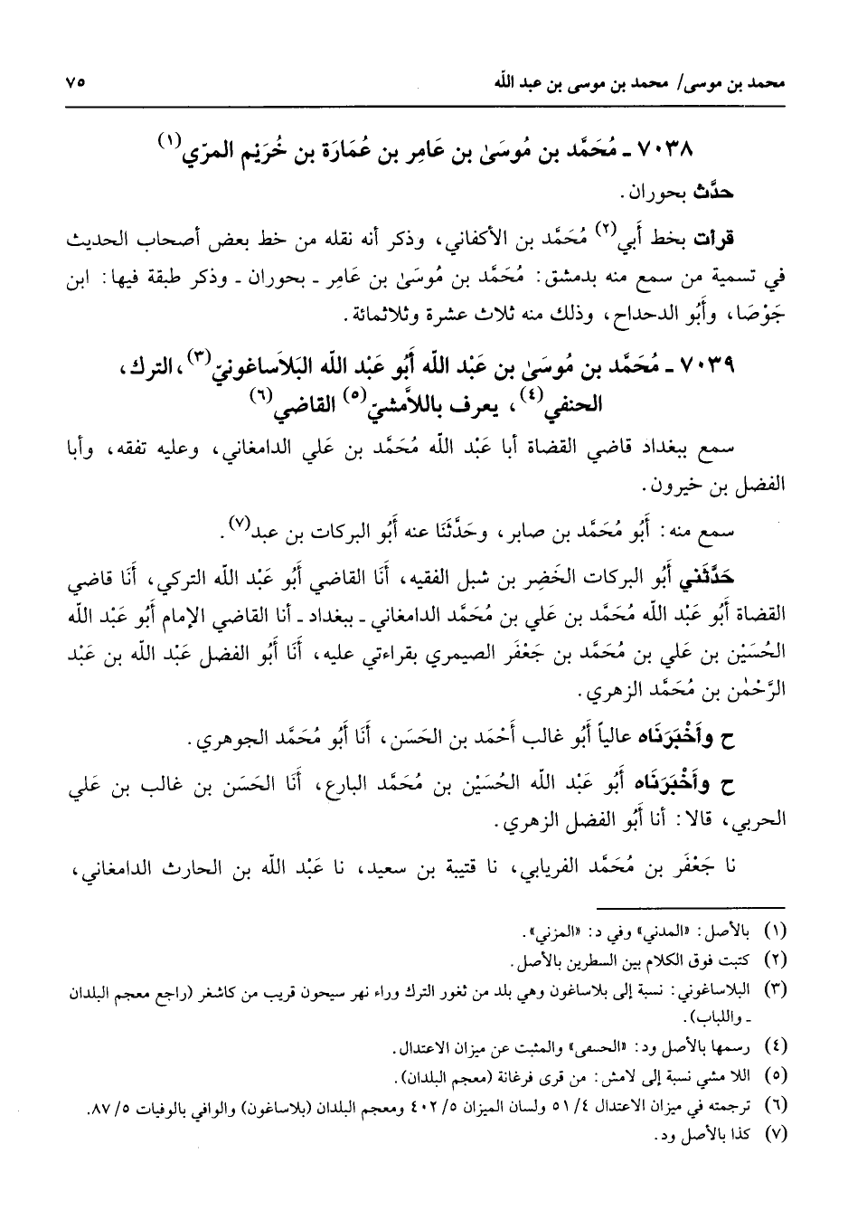 7039 - محمد بن موسى بن عبد الله أبو عبد الله البلاساغوني (3) الترك الحنفي (4) يعرف باللامشي (4) القاضي (6) سمع ببغداد قاضي القضاة أبا عبد الله محمد بن علي الدامغاني وعليه تفقه وأبا الفضل بن خيرون سمع منه أبو محمد بن صابر وحدثنا عنه أبو البركات بن عبد (7) حدثني أبو البركات الخضر بن شبل الفقيه أنا القاضي أبو عبد الله التركي أنا قاضي القضاة أبو عبد الله محمد بن علي بن محمد الدامغاني ببغداد أنا القاضي الإمام أبو عبد الله الحسين بن علي بن محمد بن جعفر الصيمري بقراءتي عليه أنا أبو الفضل عبد الله بن عبد الرحمن بن محمد الزهري ح وأخبرناه عاليا أبو غالب أحمد بن الحسن أنا أبو محمد الجوهري ح وأخبرناه أبو عبد الله الحسين بن محمد البارع أنا الحسن بن غالب بن علي الحربي قالا أنا أبو الفضل الزهري نا جعفر بن محمد الفريابي نا قتيبة بن سعيد نا عبد الله بن الحارث الدامغاني