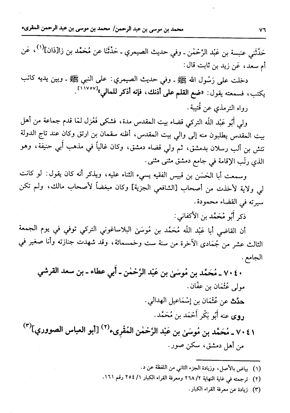 حدثني عنبسة بن عبد الرحمن وفي حديث الصيمري حدثنا عن محمد بن زاذان (1) عن أم سعد عن زيد بن ثابت قال دخلت على رسول الله (صلى الله عليه وسلم) وفي حديث الصيمري على النبي (صلى الله عليه وسلم) وبين يديه كاتب يكتب فسمعته يقول ضع القلم على أذنك فإنه أذكر للمالي رواه الترمذي عن قتيبة ولي أبو عبد الله التركي قضاء بيت المقدس مدة فشكى فعزل لما قدم جماعة من أهل بيت المقدس يطلبون منه إلى والي بيت المقدس أظنه سقمان بن ارتق وكان عند تاج الدولة تتش بن ألب رسلان بدمشق ثم ولي قضاء دمشق وكان غاليا في مذهب أبي حنيفة وهو الذي رتب الإقامة في جامع دمشق مثنى مثنى وسمعت أبا الحسن بن قبيس الفقيه يسئ الثناء عليه ويذكر أنه كان يقول لو كانت لي ولاية لأخذت من أصحاب الشافعي الجزية وكان مبغضا لأصحاب مالك ولم تكن سيرته في القضاء محمودة ذكر أبو محمد بن الأكفاني أنا القاضي أبا عبد الله محمد بن موسى البلاساغوني التركي توفي في يوم الجمعة الثالث عشر من جمادى الآخرة من سنة ست وخمسمائة وقد شهدت جنازته وأنا صغير في الجامع 7040 - محمد بن موسى بن عبد الرحمن أبي عطاء بن سعد القرشي مولى عثمان بن عفان حدث عن عثمان بن إسماعيل الهدالي رو عنه أبو بكر أحمد بن محمد 7041 - محمد بن موسى بن عبد الرحمن المقرئ (2) أبو العباس الصووري (3) من أهل دمشق سكن صور