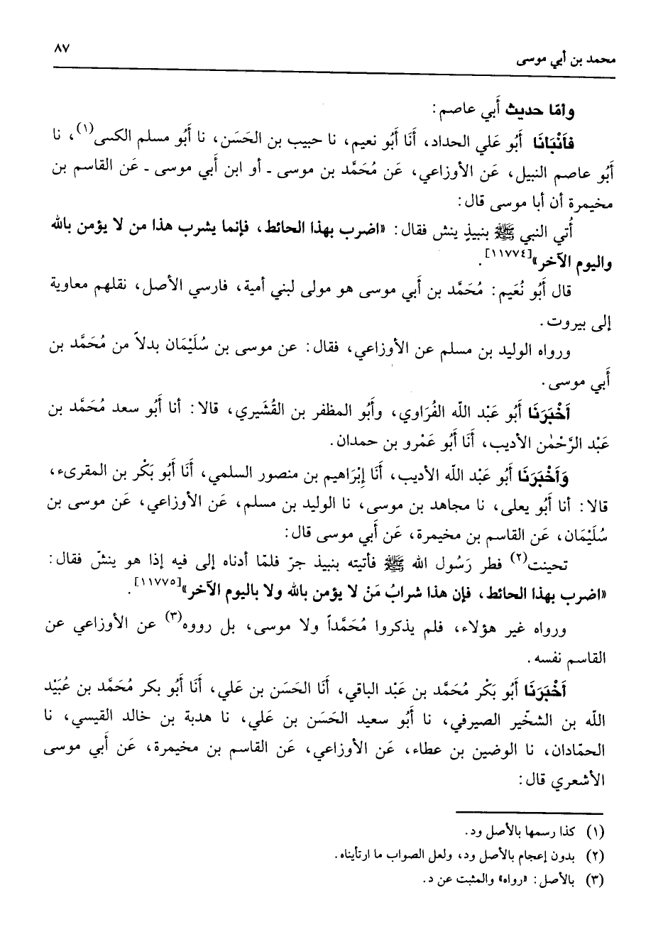 وأما حديث أبي عاصم فأنبأنا أبو علي الحداد أنا أبو نعيم نا حبيب بن الحسن نا أبو مسلم الكسي (1) نا أبو عاصم النبيل عن الأوزاعي عن محمد بن موسى أو ابن أبي موسى عن القاسم بن مخيمرة أن أبا موسى قال أتي النبي (صلى الله عليه وسلم) بنبيذ ينش فقال اضرب بهذا الحائط فإنما يشرب هذا من لا يؤمن بالله واليوم الآخر قال أبو نعيم محمد بن أبي موسى هو مولى لبني أمية فارسي الأصل نقلهم معاوية إلى بيروت ورواه الوليد بن مسلم عن الأوزاعي فقال عن موسى بن سليمان بدلا من محمد بن أبي موسى أخبرنا أبو عبد الله الفراوي وأبو المظفر بن القشيري قالا أنا أبو سعد محمد بن عبد الرحمن الأديب أنا أبو عمرو بن حمدان وأخبرنا أبو عبد الله الأديب أنا إبراهيم بن منصور السلمي أنا أبو بكر بن المقرئ قالا أنا أبو يعلى نا مجاهد بن موسى نا الوليد بن مسلم عن الأوزاعي عن موسى بن سليمان عن القاسم بن مخيمرة عن أبي موسى قال تحينت (2) فطر رسول الله (صلى الله عليه وسلم) فأتيته بنبيذ جر فلما أدناه إلى فيه إذا هو ينش فقال اضرب بهذا الحائط فإن هذا شراب من لا يؤمن بالله ولا باليوم الآخر ورواه غير هؤلاء فلم يذكروا محمدا ولا موسى بل رووه (3) عن الأوزاعي عن القاسم نفسه أخبرنا أبو بكر محمد بن عبد الباقي أنا الحسن بن علي أنا أبو بكر محمد بن عبيد الله بن الشخير الصيرفي نا أبو سعيد الحسن بن علي نا هدبة بن خالد القيسي نا الحمادان نا الوضين بن عطاء عن الأوزاعي عن القاسم بن مخيمرة عن أبي موسى الأشعري قال