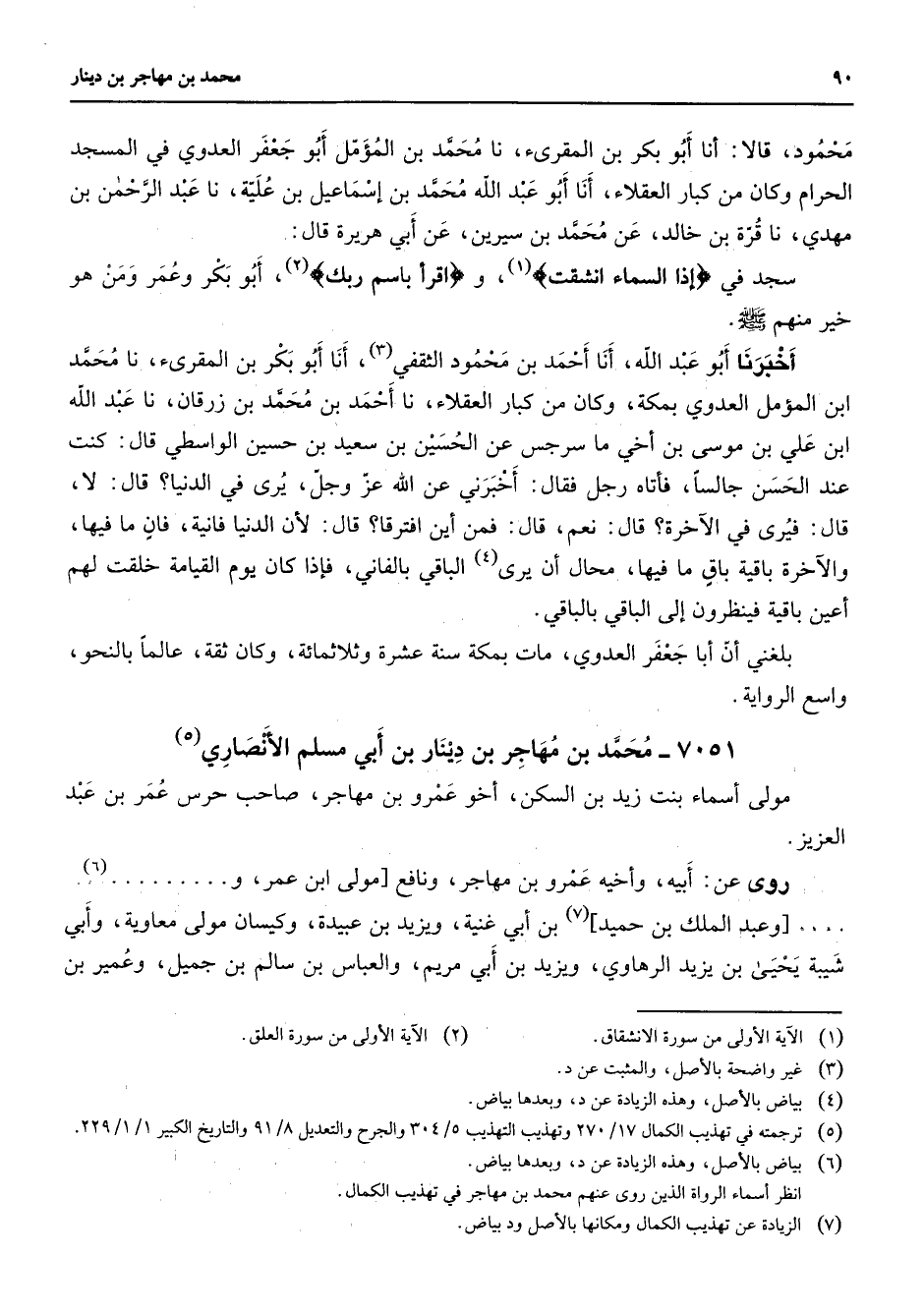 محمود قالا أنا أبو بكر بن المقرئ نا محمد بن المؤمل أبو جعفر العدوي في المسجد الحرام وكان من كبار العقلاء أنا أبو عبد الله محمد بن إسماعيل ابن علية نا عبد الرحمن بن مهدي نا قرة بن خالد عن محمد بن سيرين عن أبي هريرة قال سجد في " إذا السماء انشقت " (1) و " اقرأ باسم ربك " (2) أبو بكر وعمر ومن هو خير منهم (صلى الله عليه وسلم) أخبرنا أبو عبد الله أحمد بن محمود الثقفي (3) أنا أبو بكر بن المقرئ نا محمد ابن المؤمل العدوي بمكة وكان من كبار العقلاء نا أحمد بن محمد بن زرقان نا عبد الله ابن علي بن موسى بن أخي ماسرجس عن الحسين بن سعيد بن حسين الواسطي قال كنت عند الحسن جالسا فأتاه رجل فقال أخبرني عن الله عز وجل يرى في الدنيا قالا لا قال فيرى في الآخرة قال نعم قال فمن أين افترقا قال لأن الدنيا فانية فان ما فيها والآخرة باقية باق ما فيها محال أنا يرى الباقي بالفاني فإذا كان يوم القيامة خلقت لهم أعين باقية فينظرون إلى الباقي بالباقي بلغني أن أبا جعفر العدوي مات بمكة سنة عشرة وثلاثمائة وكان ثقة عالما بالنحو واسع الرواية 7051 - محمد بن مهاجر بن دينار بن أبي مسلم الأنصاري (5) مولى أسماء بنت زيد بن السكن أخو عمرو بن مهاجر صاحب حرس عمر بن عبد العزيز روى عن أبيه واخيه عمرو بن مهاجر ونافع مولى ابن عمر و (6) وعبد الملك بن حميد (7) بن أبي غنية ويزيد بن عبيدة وكيسان مولى معاوية وأبي شيبة يحيى بن يزيد الرهاوي ويزيد بن أبي مريم والعباس بن سالم بن جميل وعمير بن