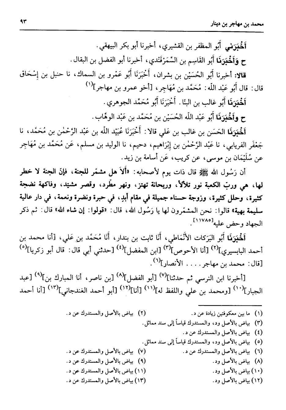 أخبرني أبو المظفر بن القشيري أخبرنا أبو بكر البيهقي وأخبرنا أبو القاسم بن السمرقندي أخبرنا أبو الفضل بن البقال قالا أخبرنا أبو الحسين بن بشران أخبرنا أبو عمرو بن السماك نا حنبل بن إسحاق قال قال أبو عبد الله محمد بن مهاجر أخو عمرو بن مهاجر (1) أخبرنا أبو غالب بن البنا أخبرنا أبو محمد الجوهري وأخبرنا أبو عبد الله الحسين بن محمد بن عبد الوهاب أخبرنا الحسن بن غالب بن علي قالا أخبرنا عبيد الله بن عبد الرحمن بن محمد نا جعفر الفريابي نا عبد الرحمن بن إبراهيم دحيم نا الوليد بن مسلم عن محمد بن مهاجر عن سليمان بن موسى عن كريب عن أسامة بن زيد أنا رسول الله (صلى الله عليه وسلم) قال ذات يوم لأصحابه ألا هل مشمر الجنة فإن للجنة لا خطر لها هي ورب الكعبة نور يتلألأ وريحانة تهتز ونهر مطرد وقصر مشيد وفاكهة نضجة كثيرة وحلل كثيرة وزوجة حسناء جميلة في مقام أبد في حبرة ونضرة ونعمة في دار عالية سليمة بهية قالوا نحن المشمرون لها يا رسول الله قال قولوا إن شاء الله قال ثم ذكر الجهاد وحض عليه أخبرنا أبو البركات الأنماطي أنا ثابت بن بندار أنا محمد بن علي أنا محمد بن أحمد البابسيري (2) أنا الأحوص (3) ابن المفضل (4) حدثني أبي قال قال أبو زكريا (5) قال محمد بن مهاجر الأنصار (6) أخبرنا ابن النرسي ثم حدثنا (7) أبو الفضل (8) بن ناصر أنا المبارك بن (9) عبد الجبار (10) ومحمد بن علي واللفظ له (11) أنا (12) أبو أحمد الغندجاني (13) أنا احمد