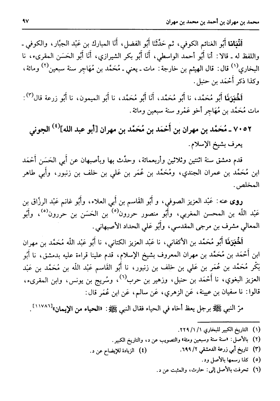 أنبأنا أبو الغنائم الكوفي ثم حدثنا أبو الفضل أنا المبارك بن عبد الجبار والكوفي واللفظ له قالا أنا أبو أحمد الواسطي أنا أبو بكر الشيرازي أنا أبو الحسن المقرئ نا البخاري (1) قال قال الهيثم بن خارجة مات يعني محمد بن مهاجر سنة سبعين ومائة وكذا ذكر أحمد بن حنبل أخبرنا أبو محمد نا أبو محمد أنا أبو محمد نا أبو الميمون نا أبو زرعة قال مات محمد بن مهاجر أخو عمرو سنة سبعين ومائة 7052 - محمد بن مهران بن أحمد بن محمد بن مهران أبو عبد الله الجوني يعرف بشيخ الإسلام قدم دمشق سنة اثنتين وثلاثين وأربعمائة وحدث بها وبأصبهان عن أبي الحسن أحمد ابن محمد بن عمران الجندي ومحمد بن عمر بن علي بن خلف بن زنبور وأبي طاهر المخلص روى عنه عبد العزيز الصوفي وأبو القاسم بن أبي العلاء وأبو غانم عبد الرزاق بن عبد الله بن المحسن المغربي وأبو منصور حررون (5) بن الحسن بن حررون (5) وأبو المعالي مشرف بن مرجى المقدسي وأبو علي الحداد الأصبهاني أخبرنا أبو محمد بن الأكفاني نا عبد العزيز الكتاني نا أبو عبد الله محمد بن مهران ابن أحمد بن محمد بن مهران المعروف بشيخ الإسلام قدم علينا قراءة عليه بدمشق نا أبو بكر محمد بن عمر بن علي بن خلف بن زنبور نا أبن القاسم عبد الله بن محمد بن عبد العزيز البغوي نا أحمد بن حنبل وزهير بن حرب (6) وسريج بن يونس وابن المقرئ قالوا نا سفيان بن عيينة عن الزهري عن سالم عن ابن عمر قال مر النبي (صلى الله عليه وسلم) برجل يعظ أخاه في الحياء فقال النبي صلى الله عليه وسلم) الحياء من الإيمان