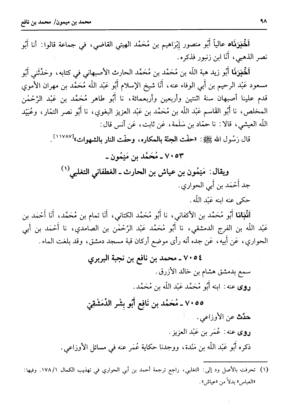 7053 - محمد بن ميمون - ويقال ميمون بن عياش بن الحارث الغطفاني التغلبي (1) جد أحمد بن أبي الحواري حكى عنه ابنه عبد الله أنبأنا أبو محمد بن الأكفاني نا أبو محمد الكتاني أنا تمام بن محمد أنا أحمد بن عبد الله بن الفرج الدمشقي نا أبو محمد عبد الرحمن بن الصامدي نا أحمد بن أبي الحواري عن أبيه عن جده أنه رأى موضع أركان قبة مسجد دمشق وقد بلغت الماء 7054 - محمد بن نافع بن نجبة البربري سمع بدمشق هشام بن خالد الأزرق روى عنه ابنه أبو محمد عبد الله بن محمد 7055 - محمد بن نافع أبو بشر الدمشقي حدث عن الأوزاعي روى عنه عمر بن عبد العزيز ذكره أبو عبد الله بن مندة ووجدنا حكاية عمر عنه في مسائل الأوزاعي