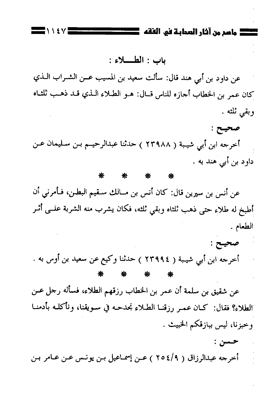 عن داود بن أبي هند قال: سألت سعيد بن المسيب عن الشراب الذي كان عمر بن الخطاب أجازه للناس قال: هو الطلاء الذي قد ذهب ثلثاه وبقى ثلثه.