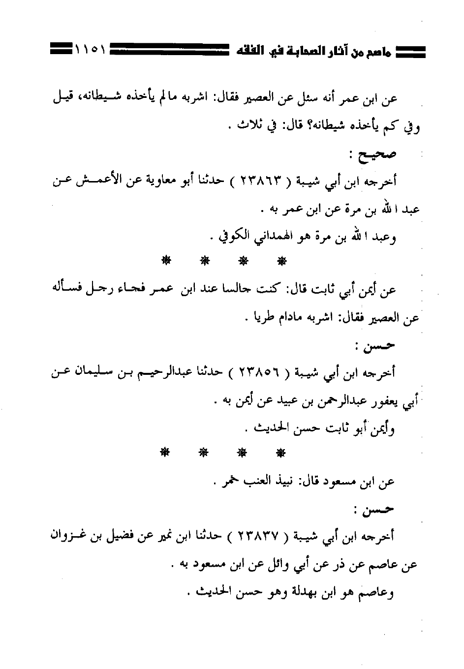 عن أيمن أبي ثابت قال: كنت جالسا عند ابن عمر فجاء رجل فسأله عن العصير فقال: اشربه ما دام طريا.