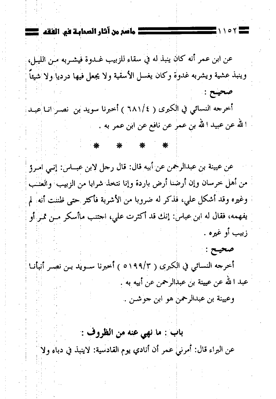 عن عيينة بن عبد الرحمن عن أبيه قال: قال رجل لابن عباس: إني امرؤ من أهل خرسان وإن أرضنا أرض باردة وإنا نتخذ شرابا من الزبيب والعنب وغيره وقد أشكل علي، فذكر له ضروبا من الأشربة فأكثر حتى ظننت أنه لم يفهمه، فقال له ابن عباس: إنك قد أكثرت علي، اجتنب ما أسكر من تمر أو زبيب أو غيره.