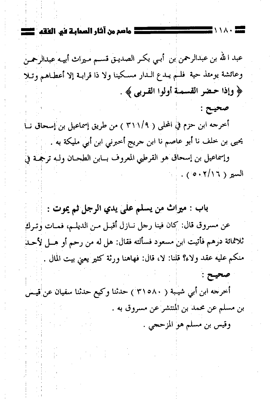 عبد الله بن عبد الرحمن بن أبي بكر الصديق قسم ميراث أبيه عبد الرحمن وعائشة يومئذ حية فلم يدع الدار مسكينا ولا ذا قرابة إلا أعطاهم وتلا {وَإِذَا حَضَرَ الْقِسْمَةَ أُولُو الْقُرْبَى}.