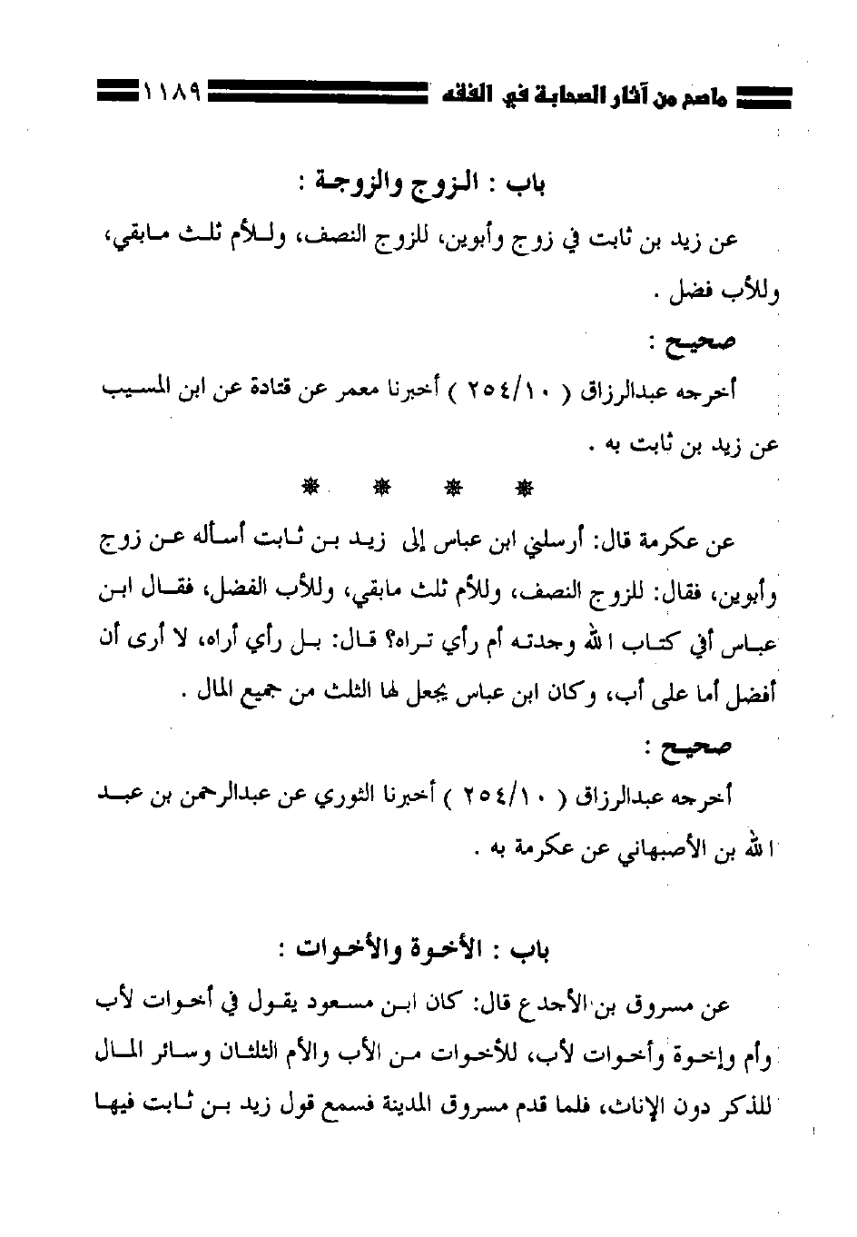 عن مسروق بن الأجدع قال: كان ابن مسعود يقول في أخوات لأب وأم وإخوة وأخوات لأب، للأخوات من الأب والأم الثلثان وسائر المال للذكر دون الإناث، فلما قدم مسروق المدينة فسمع قول زيد بن ثابت فيها