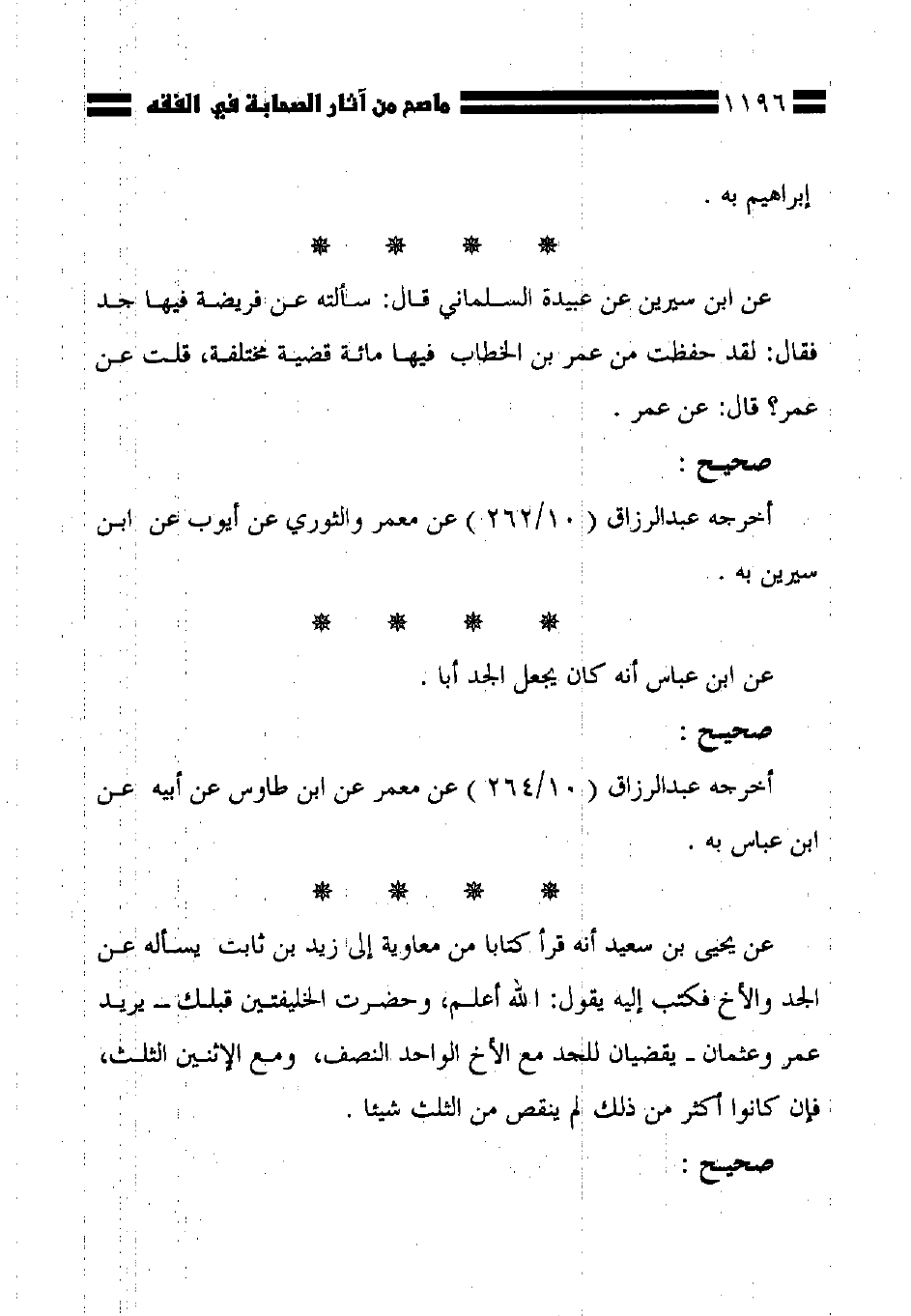 عن ابن سيرين عن عبيدة السلماني قال: سألته عن فريضه فيها جد فقال: لقد حفظت من عمر بن الخطاب فيها مائة قضية مختلفة، قلت عن عمر؟ قال: عن عمر.