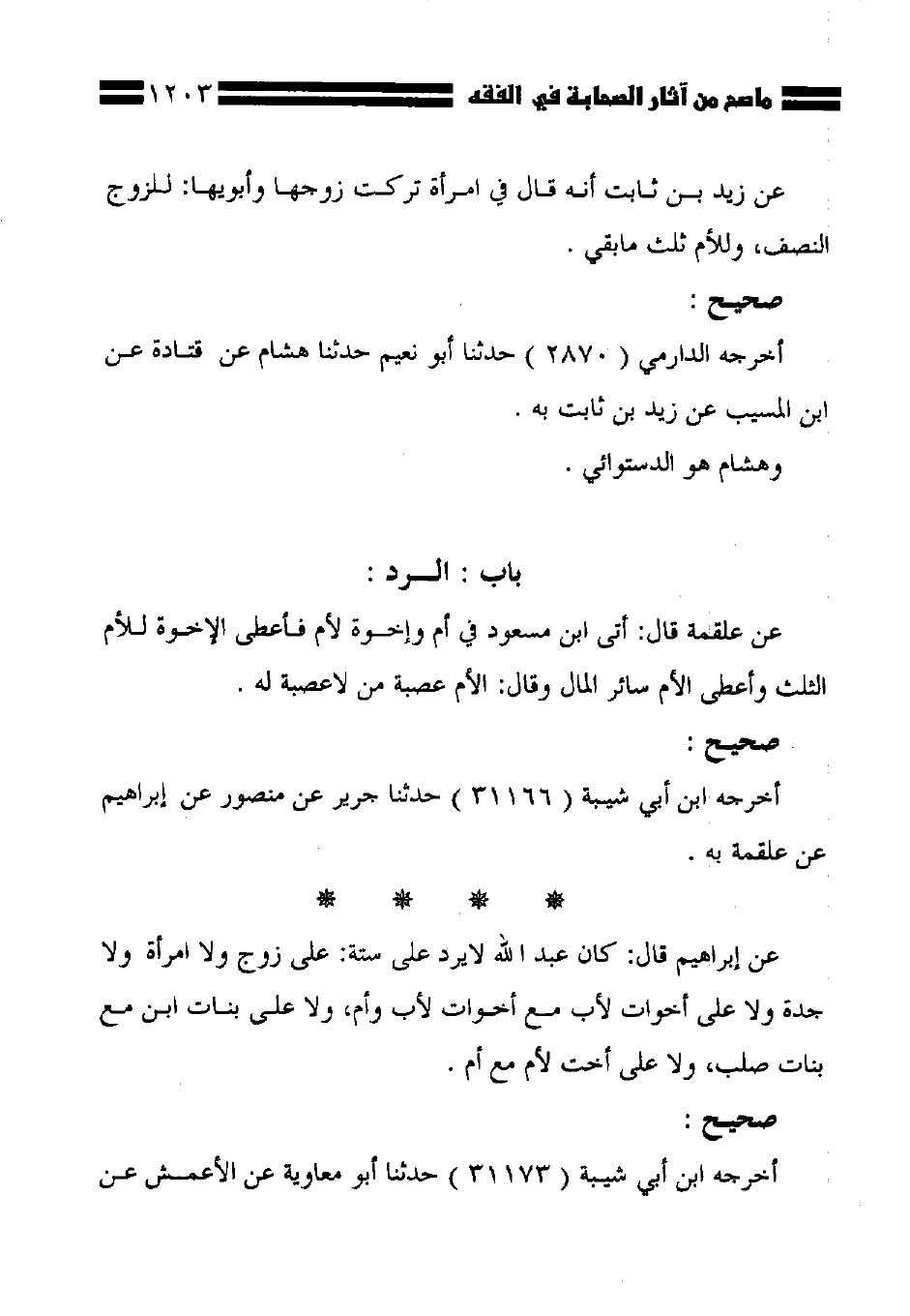 عن إبراهيم قال: كان عبد الله لايرد على ستة: على زوج ولا امرأة ولا جدة ولا على أخوات لأب مع أخوات لأب وأم، ولا علي بنات ابن مع بنات صلب، ولاعلى أخت لأم مع أم.