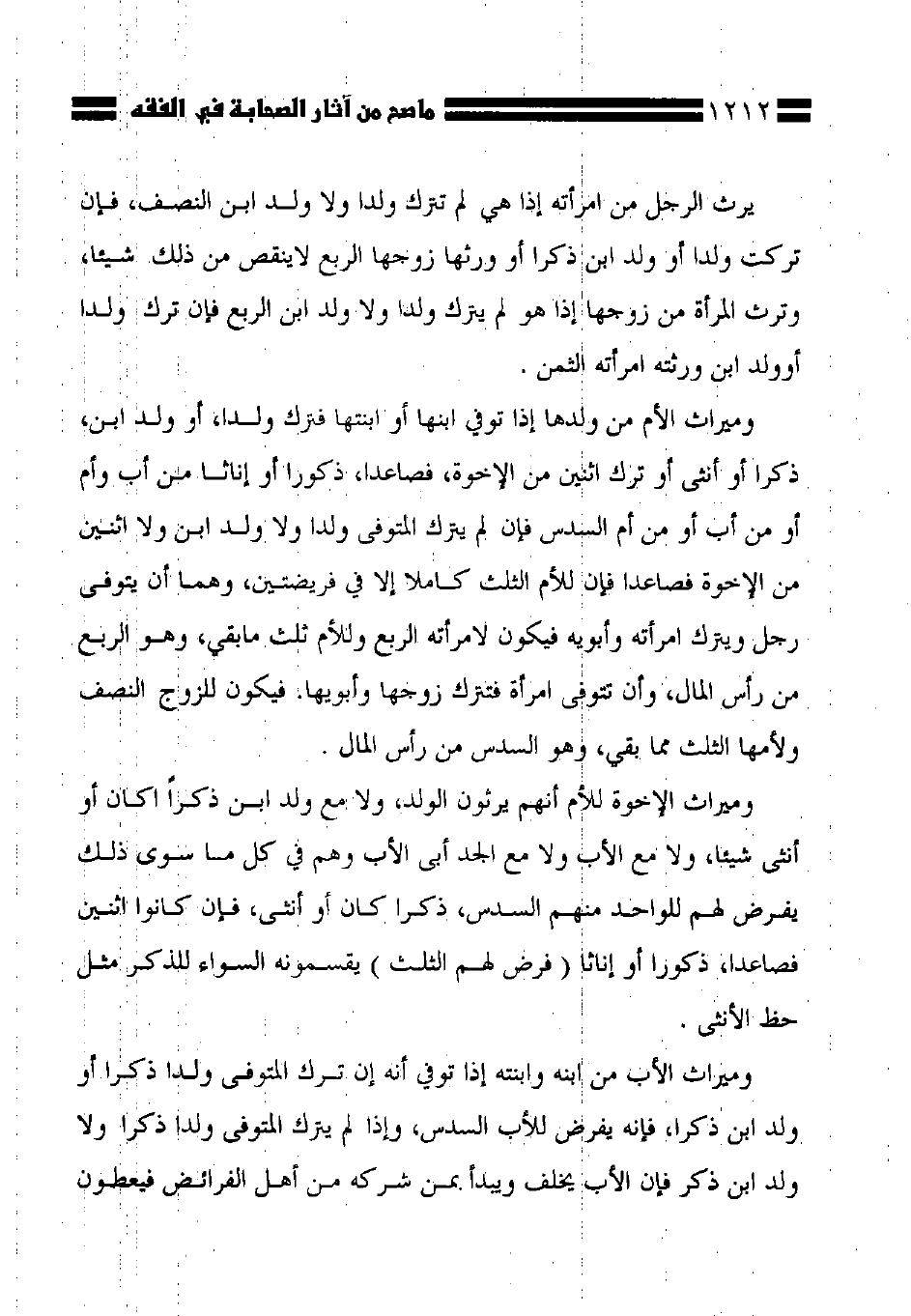 يرث الرجل من امرأته إذا هي لم تترك ولدا ولا ولد ابن النصف، فإن تركت ولدا أو ولد ابن ذكرا أو ورثها زوجها الربع لا ينقص من ذلك شيئا، وترث المرأة من زوحها إذا هولم يترك ولدا ولا ولد ابن الربع فإن ترك ولدا أو ولد ابن ورثته امرأته الثمن.