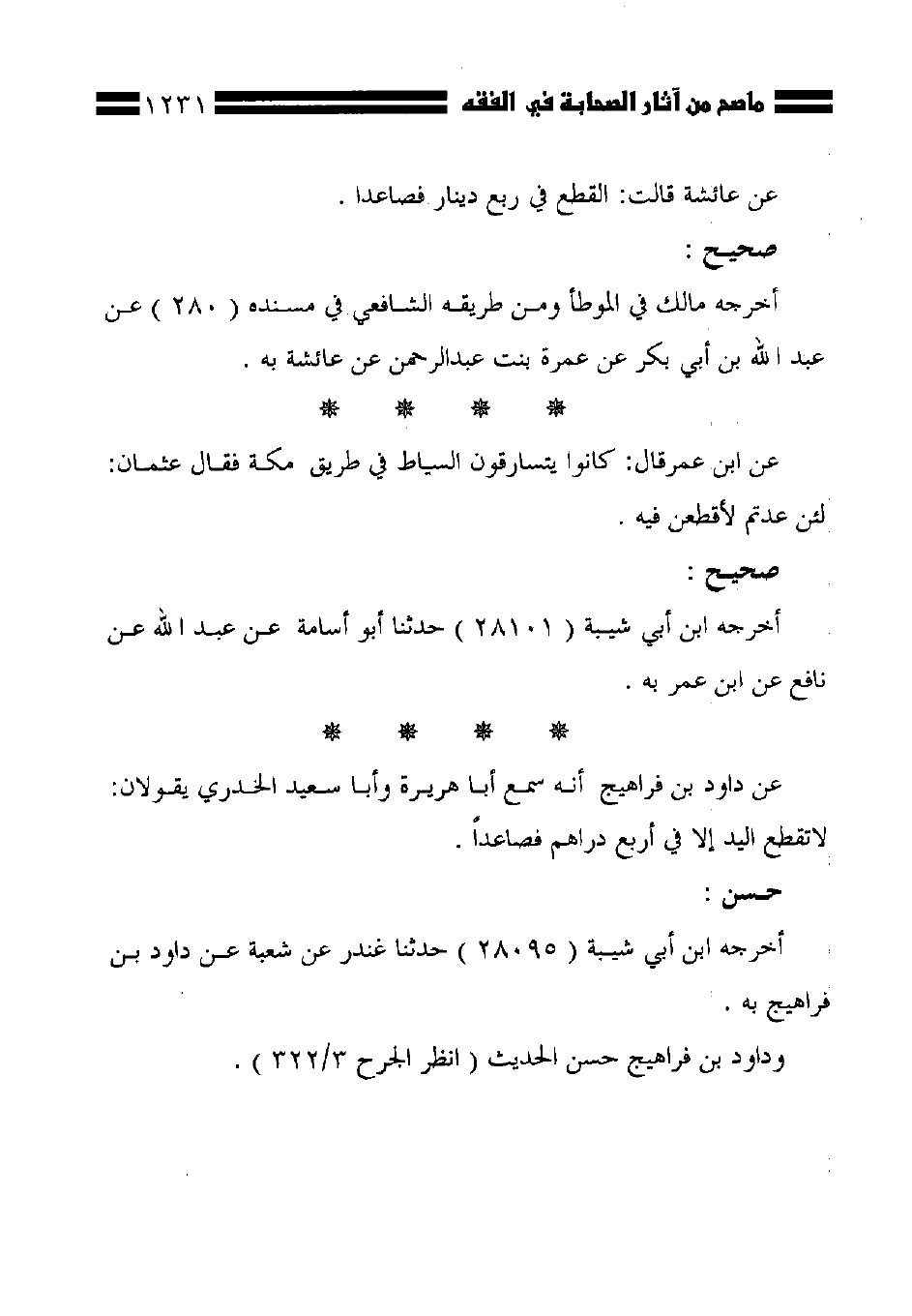 عن ابن عمر قال: كانوا يتسارقون السياط في طريق مكة فقال عثمان: لئن عدتم لأقطعن فيه.