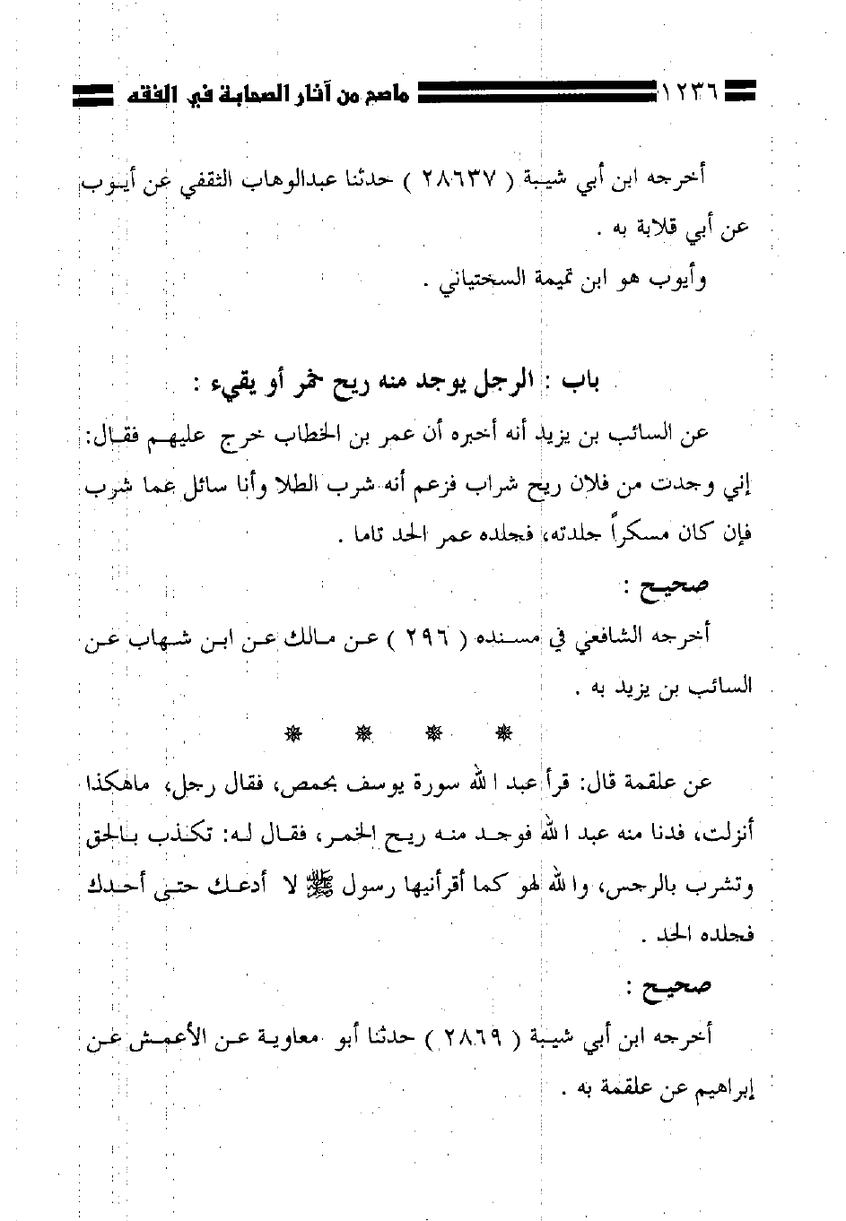 عن علقمة قال: قرأ عبد الله سورة يوسف بحمص، فقال رجل، ما هكذا أنزلت، فدنا منه عبد الله فوجد منه ريح الخمر، فقال له: تكذب بالحق وتشرب بالرجس، والله لهو كما أقرأنيها رسول - صلى الله عليه وسلم - لا أدعك حتى أحدك فجلده الحد.