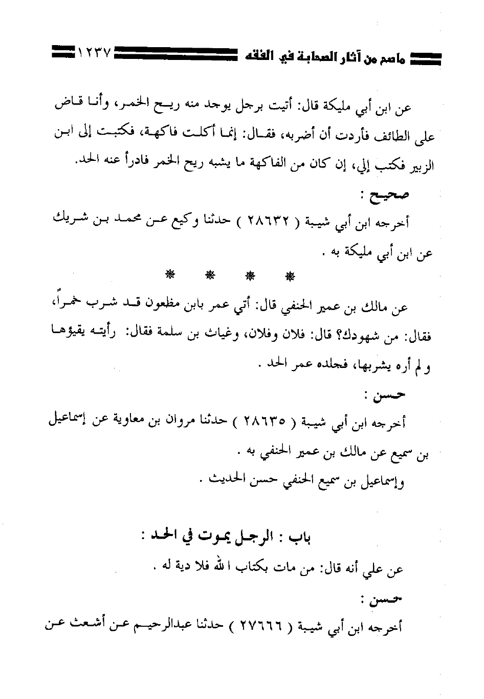 عن ابن أبي مليكة قال: أتيت برجل يوجد منه ريح الخمر، وأنا قاض على الطائف فاردت أن أضربه، فقال: إنما أكلت فاكهة، فكتبت إلى ابن الزبير فكتب إلي، إن كان من الفاكهة ما يشبه ريح الخمر فادرأ عنه الحد.