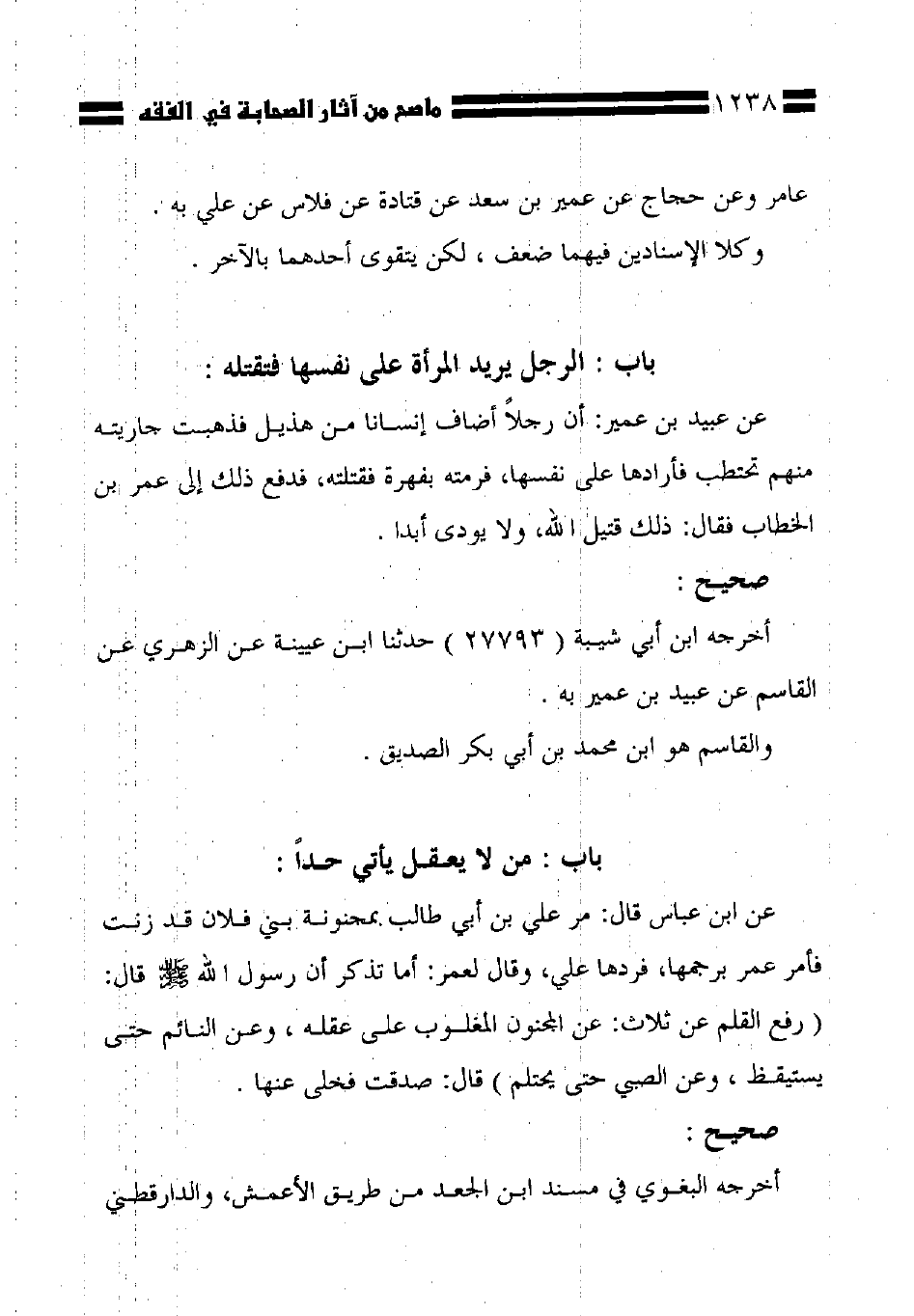 عن ابن عباس قال: مر علي بن أبي طالب بمجنونة بني فلان قد زنت فأمر عمر برجمها، فردها علي، وقال لعمر: أما تذكر أن رسول الله - صلى الله عليه وسلم - قال: (رفع القلم عن ثلاث: عن المجنون المغلوب على عقله، وعن النائم حتى يستيقظ، وعن الصبي حتى يحتلم) قال: صدقت فخلى عنها.
