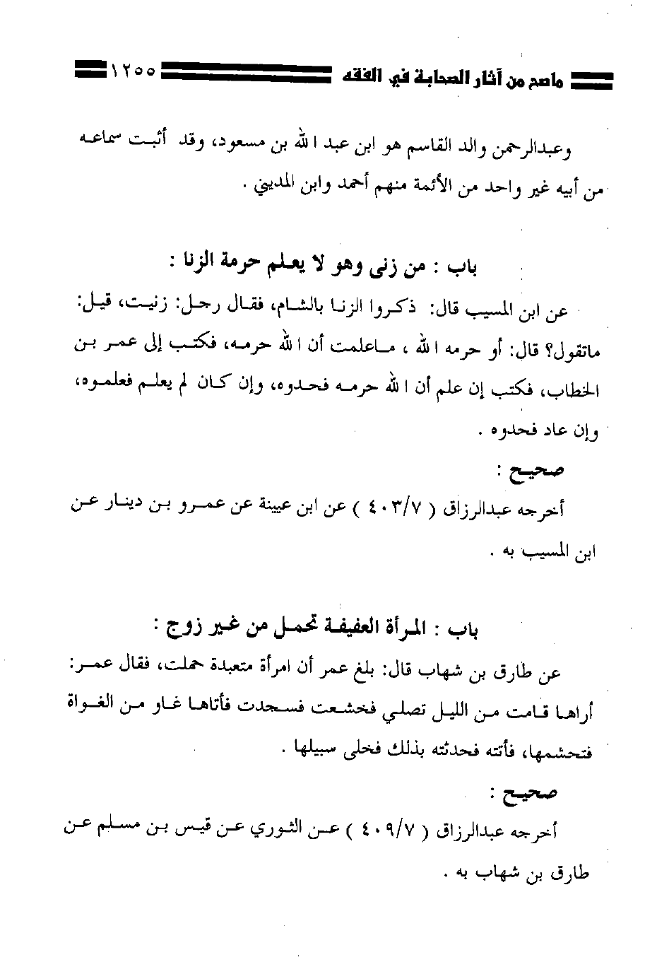 عن ابن المسيب قال: ذكروا الزنا بالشام، فقال رجل: زنيت، قيل: ما تقول؟ قال: أو حرمه الله، ماعلمت أن الله حرمه، فكتب إلى عمر بن الخطاب، فكتب إن علم أن الله حرمه فحدوه، وإن كان لم يعلم فعلموه، وإن عاد فحدوه.