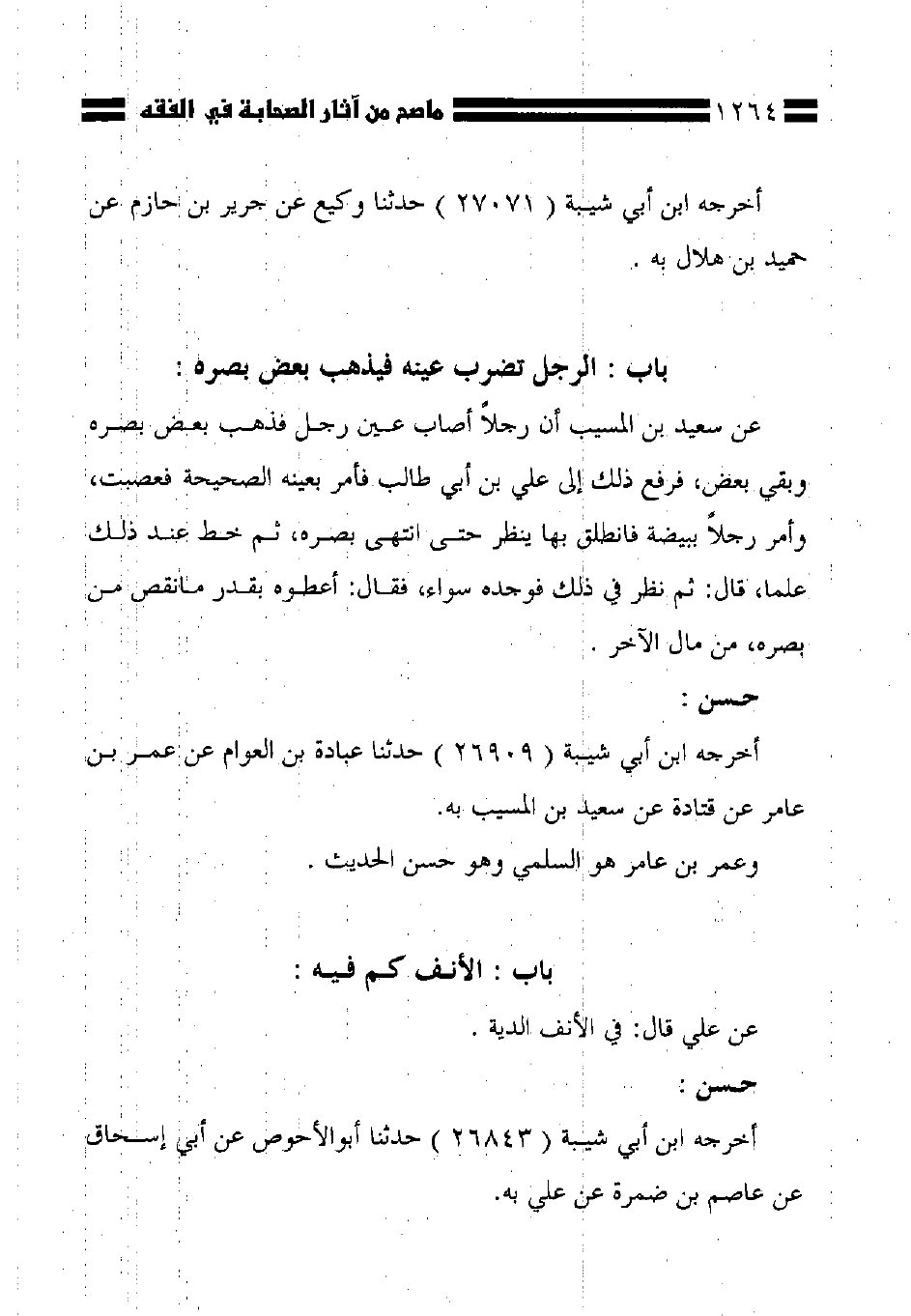 عن سعيد بن السيب أن رجلًا أصاب عين رجل فذهب بعض بصره وبقى بعض، فرفع ذلك إلى علي بن أبي طالب فأمر بعينه الصحيحة فعصبت، وأمر رجلاً ببيضة فانطق بها ينظر حتى انتهى بصره، ثم خط عند ذلك علما، قال: ثم نظر في ذلك فوجده سواء، فقال: أعطوه بقدر ما نقص من بصره، من مال الآخر.