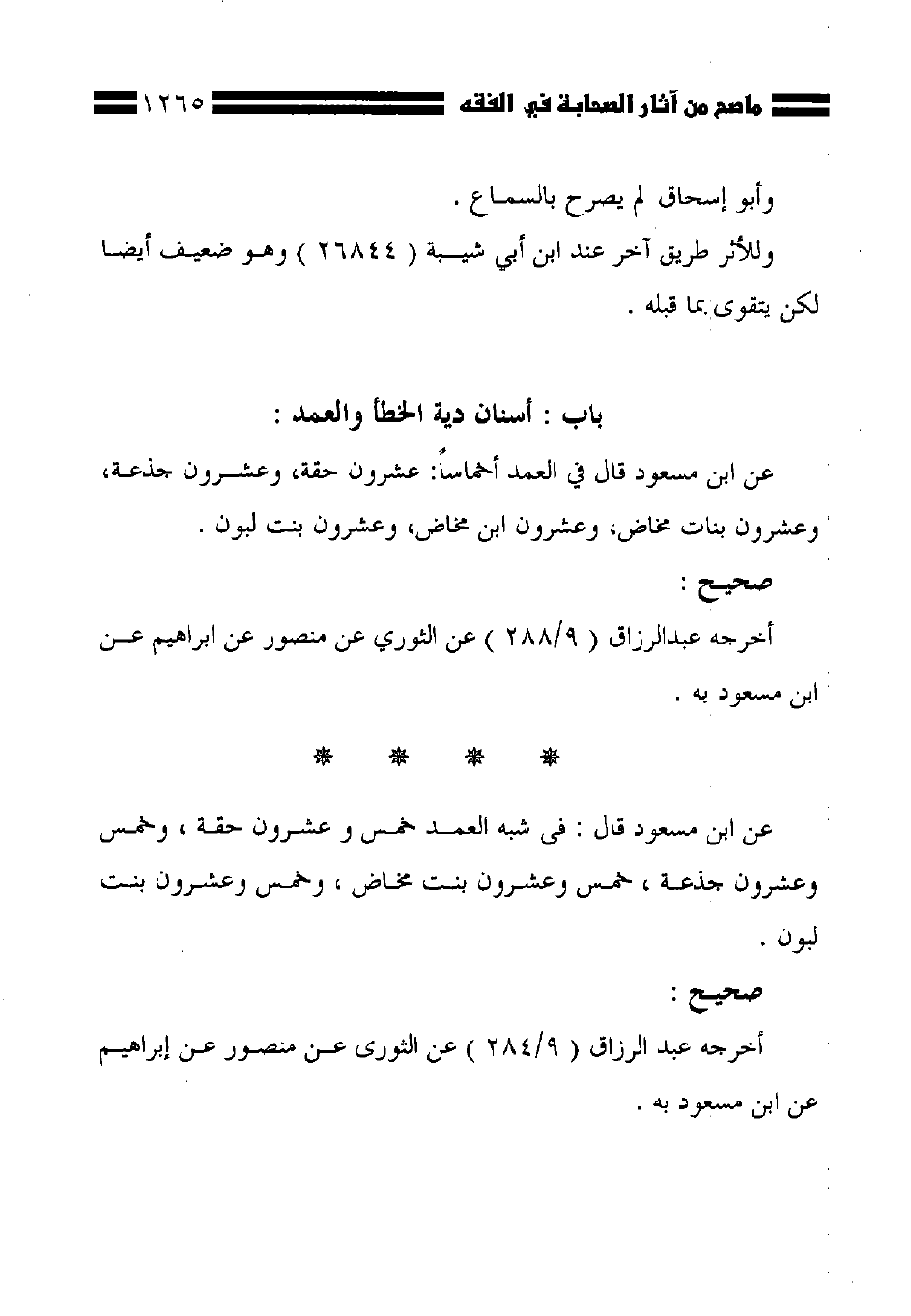 عن ابن مسعود قال: في شبه العبد خمس وعشرون حقة، وخمس وعشرون جذعة، حمس وعشرون بنت مخاض، وخمس وعشرون بنت لبون.