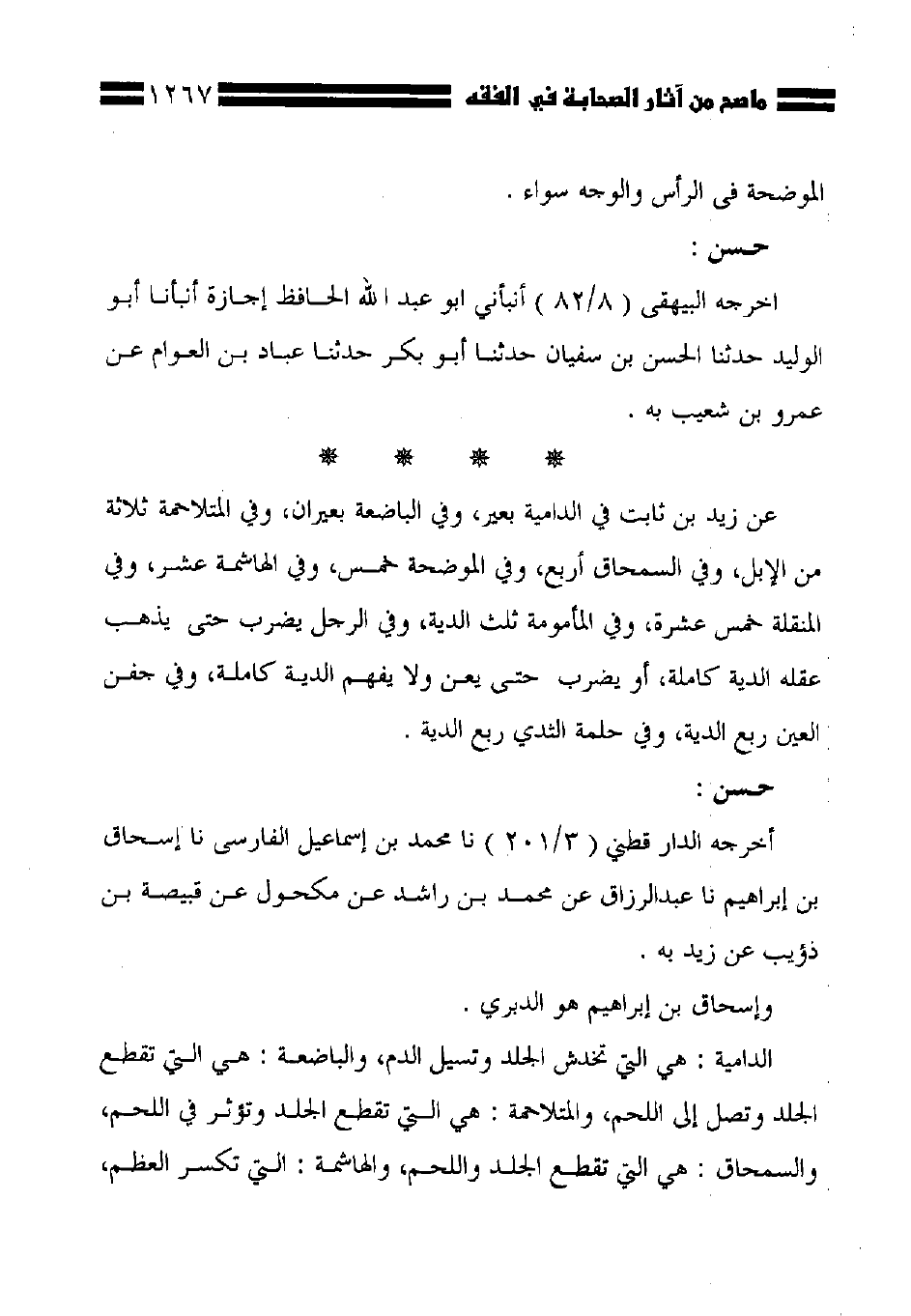 عن زيد بن ثابت في الدامية بعير، وفي الباضعة بعيران، وفي المتلاحمة ثلاثة من الإبل، وفي السمحاق أربع، وفي الموضحة خمس، وفي الهاشمة عشر، وفي المنقلة خمس عشرة، وفي المأمومة ثلث الدية، وفي الرجل يضرب حتى يذهب عقله الدية كاملة، أو يضرب حتى يعن ولا يفهم الدية كاملة، وفي جفن العين ربع الدية، وفي حلمة الثدي ربع الدية.