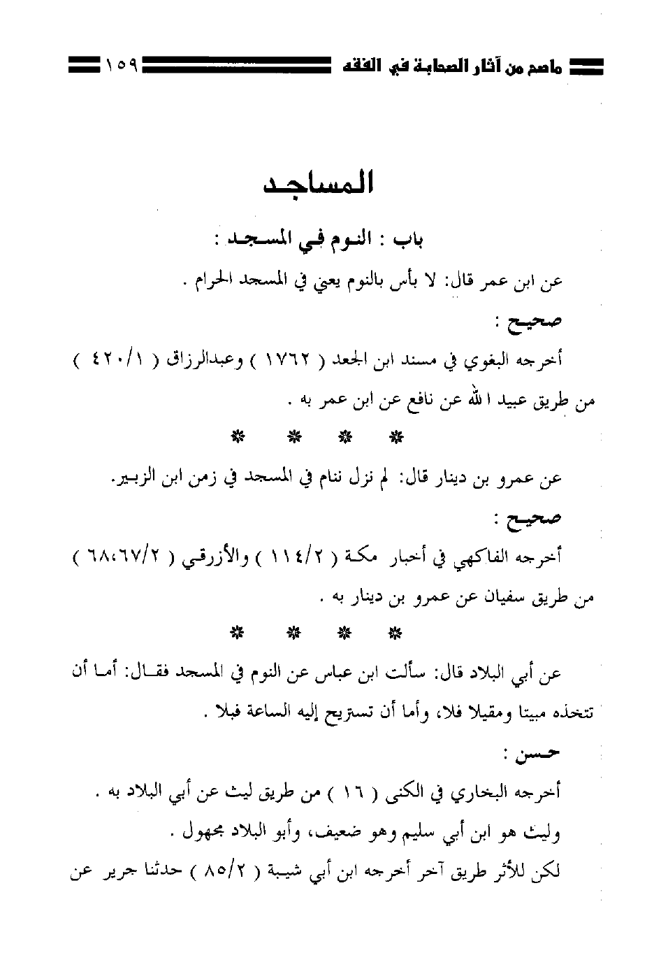 عن أبي البلاد قال: سألت ابن عباس عن النوم في المسجد فقال: أما أن تتخذه مبيتا ومقيلا فلا، وأما أن تستريح إليه الساعة فبلا.