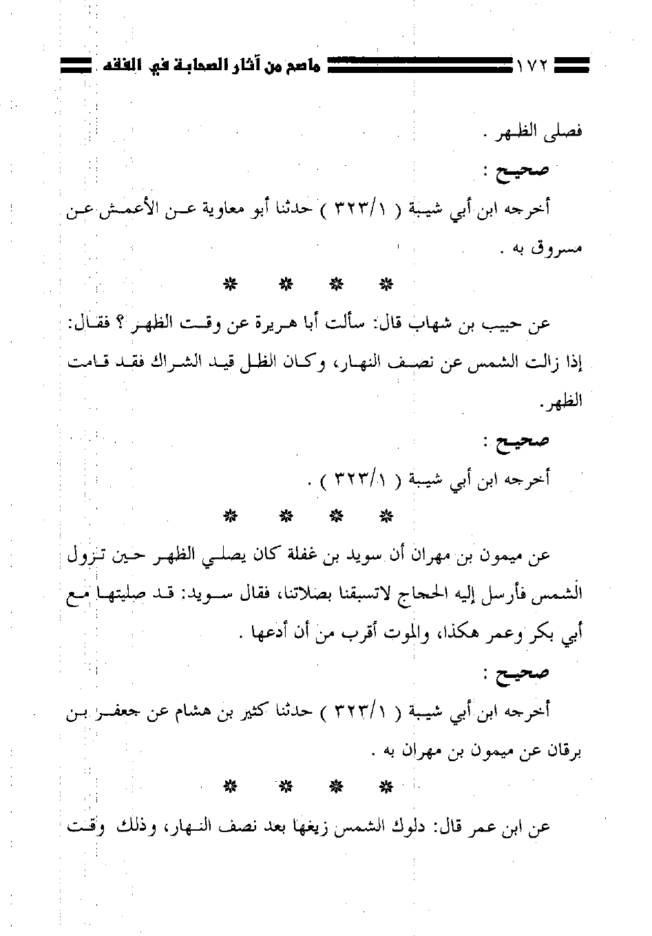 عن حبيب بن شهاب قال: سألت أبا هريرة عن وقت الظهر؟ فقال: إذا زالت الشمس عن نصف النهار، وكان الظل قيد الشراك فقد قامت الظهر.