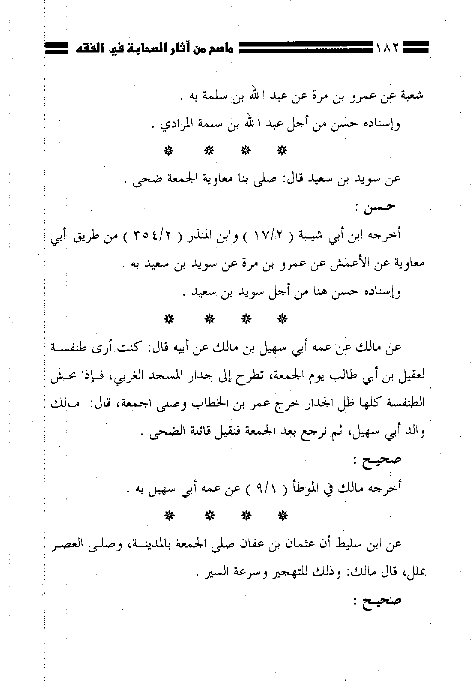 عن مالك عن عمه أبي سهيل بن مالك عن أبيه قال: كنت أرى طنفسة لعقيل بن أبي طالب يوم الجمعة، تطرح إلى جدار المسجد الغربي، فإذا نحش الطنفسة كلها ظل الجدار خرج عمر بن الخطاب وصلى الجمعة، قال: مالك والد أبي سهيل، ثم نرجع بعد الجمعة فنقيل قائلة الضحى.