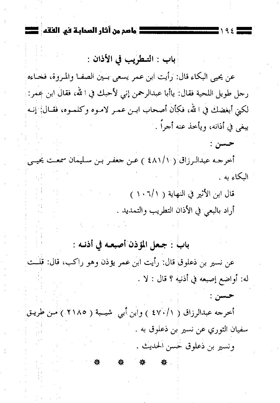 عن نسير بن ذعلوق قال: رأيت ابن عمر يؤذن وهو راكب، قال: قلت له: أواضع إصبعه في أذنيه؟ قال: لا.