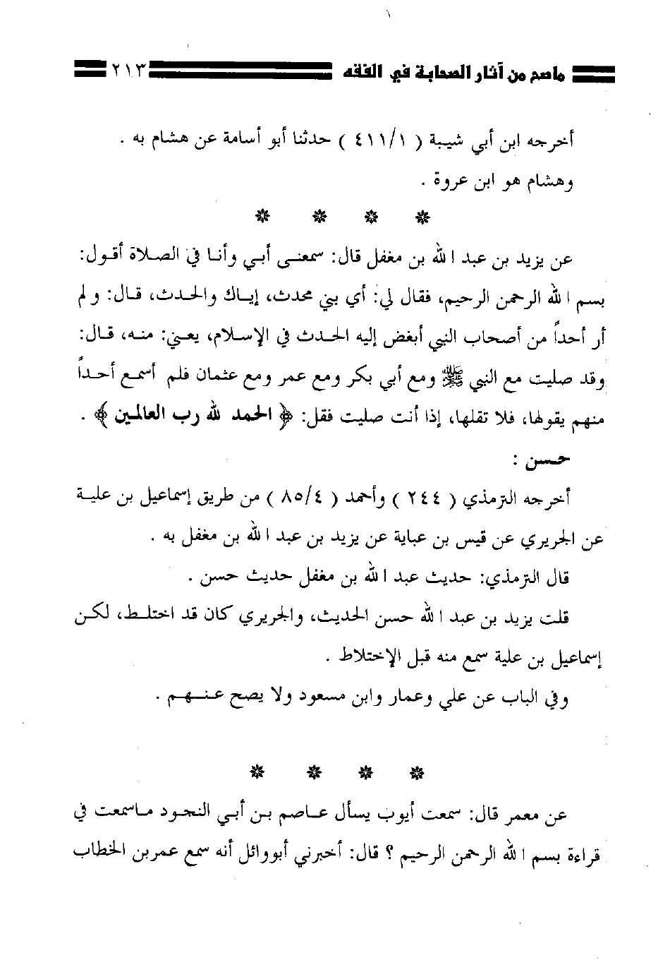 عن يزيد بن عبد الله بن مغفل قال: سعنى أبي وأنا في الصلاة أقول: بِسْمِ اللَّهِ الرَّحْمَنِ الرَّحِيمِ، فقال لي: أي بني محدث، إياك والحدث، قال: ولم أر أحدًا من أصحاب النبي أبغض إليه الحدث في الإسلام، يعني: منه، قال: وقد صليت مع النبي - صلى الله عليه وسلم - ومع أبي بكر ومع عمر ومع عثمان فلم أسمع أحدًا منهم يقولها، فلا تقلها، إذا أنت صليت فقل: {الْحَمْدُ لِلَّهِ رَبِّ الْعَالَمِينَ}.