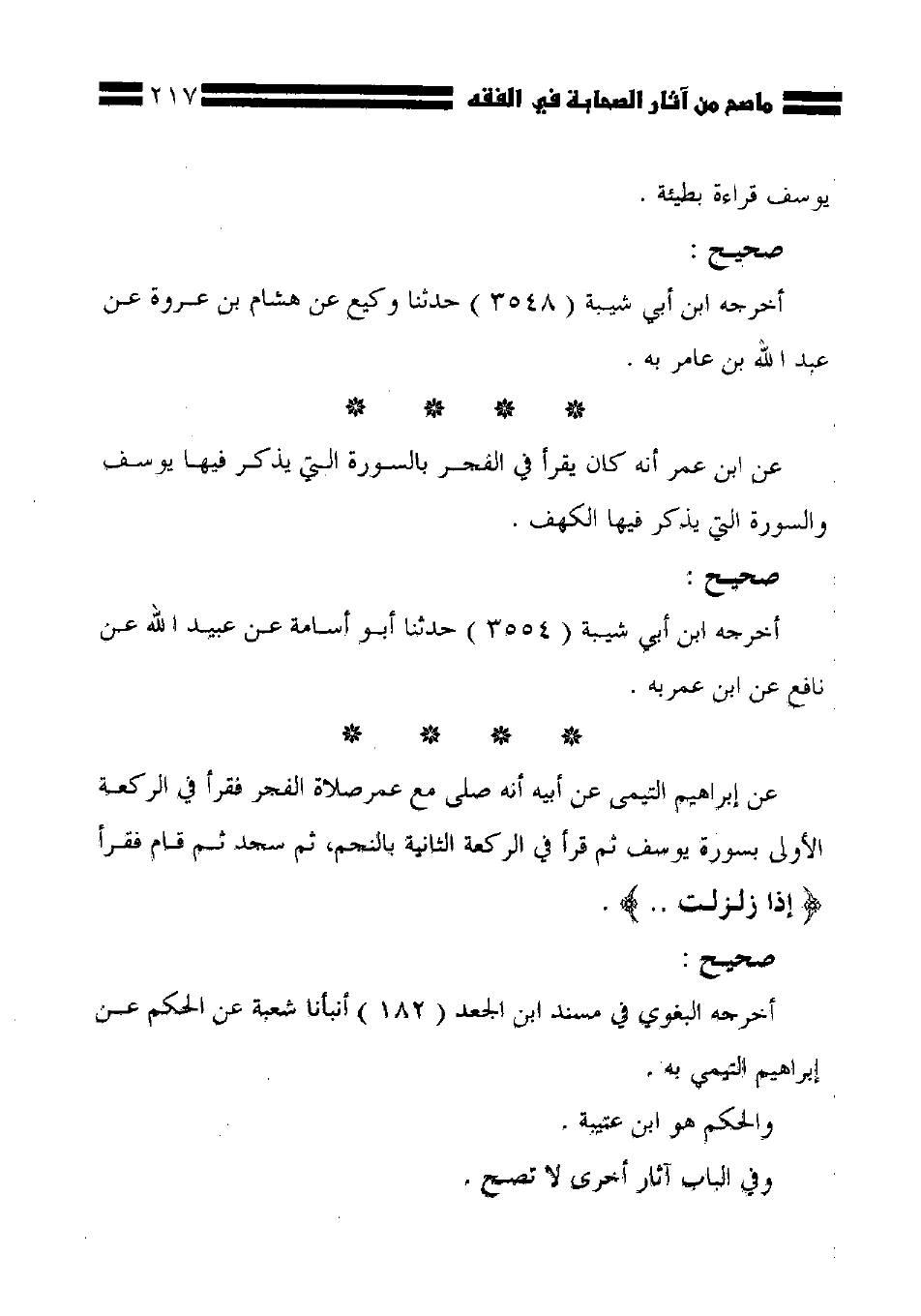 عن إبراهيم التيمي عن أبيه أنه صلى مع عمر صلاة الفجر فقرأ في الركعة الأولى بسورة يوسف ثم قرأ في الركعة الثانية بالنجم، ثم سجد ثم قام فقرأ {إِذَا زُلْزِلَتِ ..}.