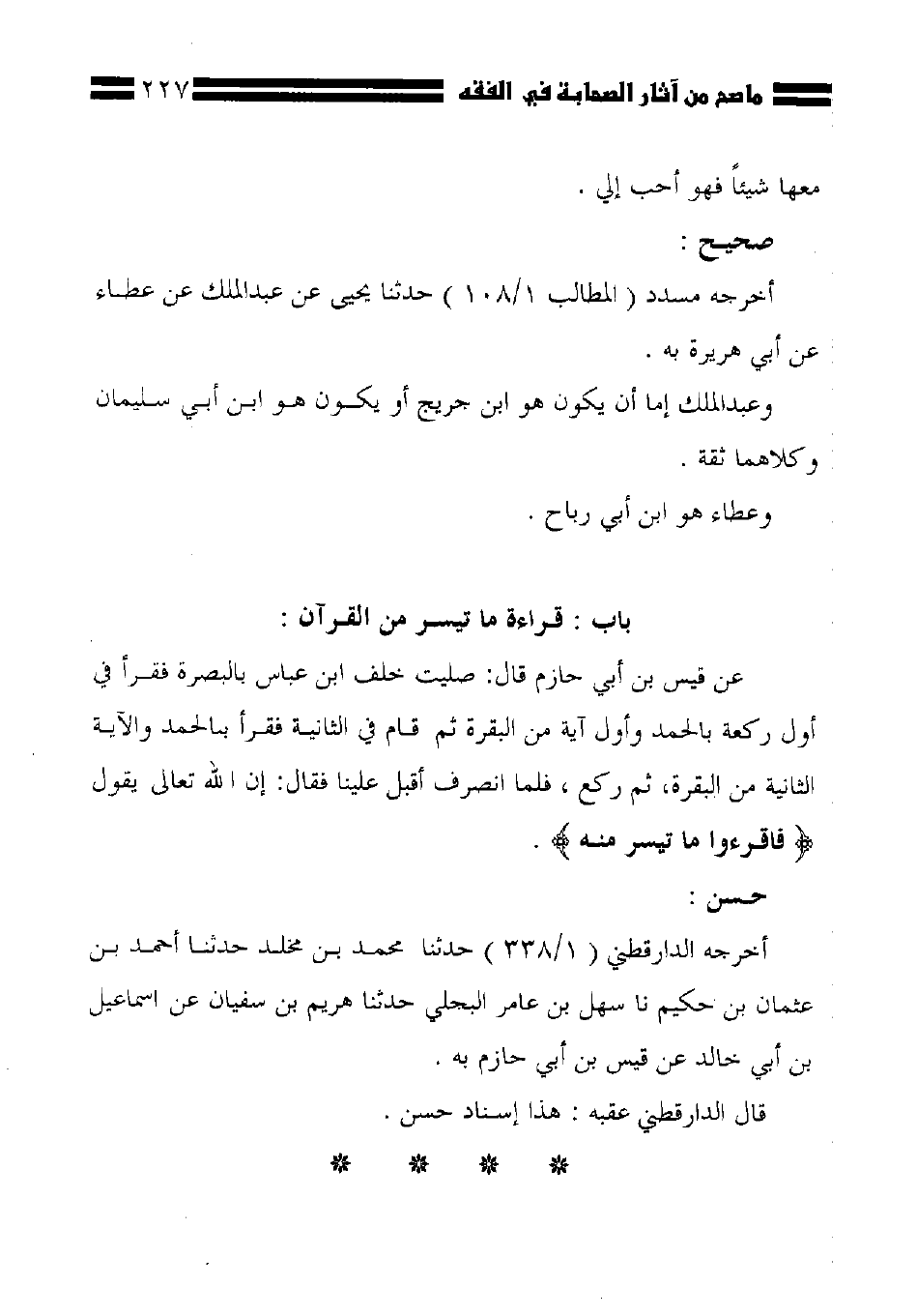 عن قيس بن أبي حازم قال: صليت خلف ابن عباس بالبصرة فقرأ في أول ركعة بالحمد وأول آية من البقرة ثم قام في الثانية فقرأ بالحمد والآية الثانية من البقرة، ثم ركع، فلما انصرف أقبل علينا فقال: إن الله تعالى يقول {فَاقْرَءُوا مَا تَيَسَّرَ مِنْهُ}.