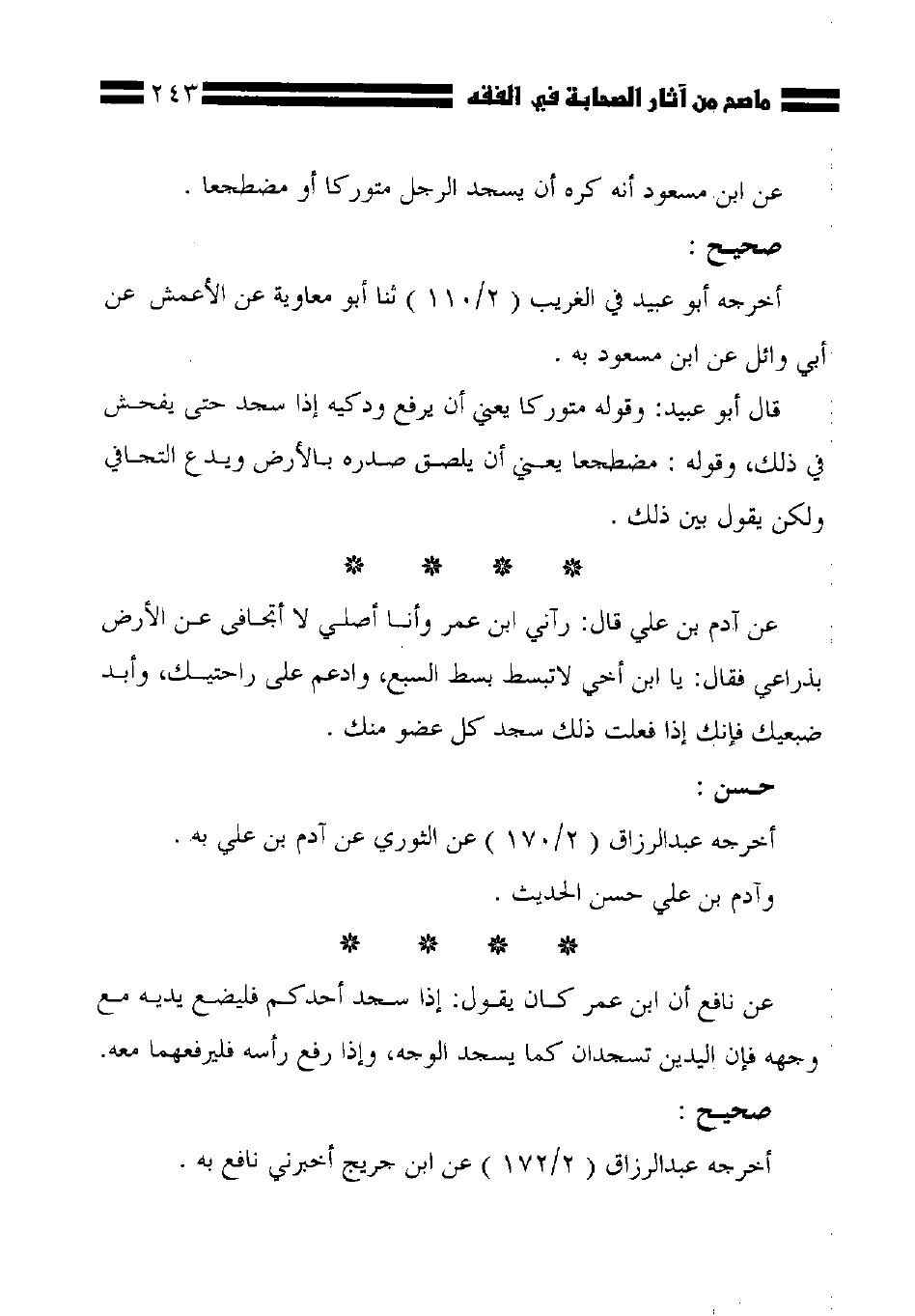 عن آدم بن علي قال: رآني ابن عمر وأنا أصلي لا أتجافى عن الأرض بذراعى فقال: يا ابن أخي لا تبسط بسط السبع، وادعم على راحتيك، وأبد ضبعيك فإنك إذا فعلت ذلك سجد كل عضو منك.