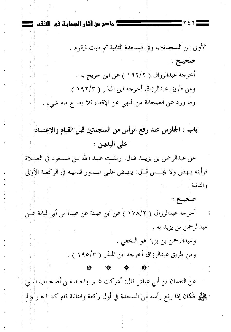 عن عبد الرحمن بن يزيد قال: رمقت عبد الله بن مسعود في الصلاة فرأيته ينهض لا يجلس قال: ينهض على صدور قدميه في الركعة الأولى والثانية. صحيح: