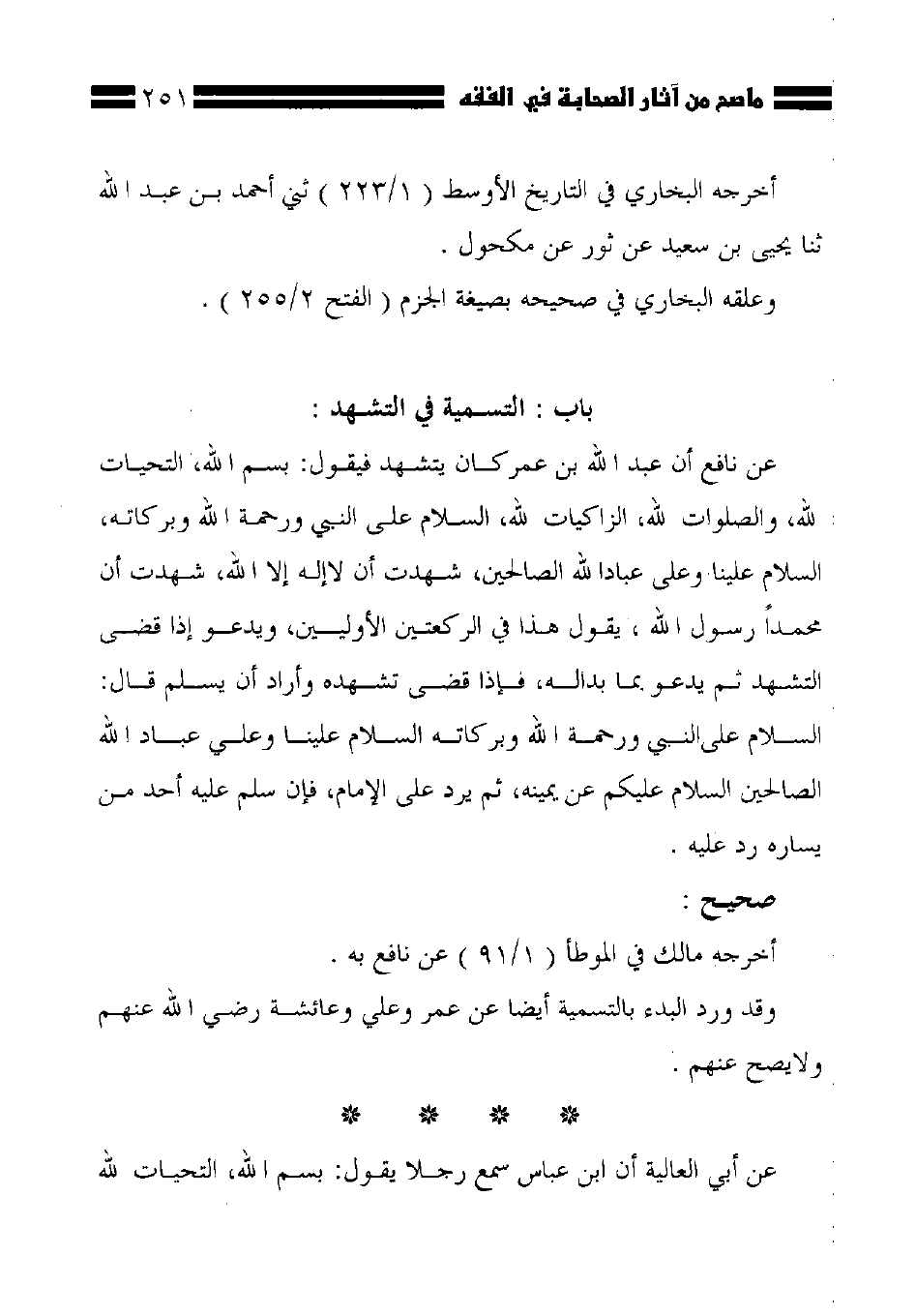 عن نافع أن عبد الله بن عمر كان يتشهد فيقول: بسم الله، التحيات لله، والصلوات لله، الزاكيات لله، السلام على النبي ورحمة الله وبركاته، السلام علينا وعلى عبادالله الصالحين، شهدت أن لا إله إلا الله، شهدت أن محمدًا رسول الله، يقول هذا في الركعتين الأوليين، ويدعو إذا قضى التشهد ثم يدعو. مما بداله، فإذا قضى تشهده وأراد أن يسلم قال: السلام على النبي ورحمة الله وبركاته السلام علينا وعلي عباد الله الصالحين السلام عليكم عن يمينه، ثم يرد على الإمام، فإن سلم عليه أحد من يساره رد عليه.
