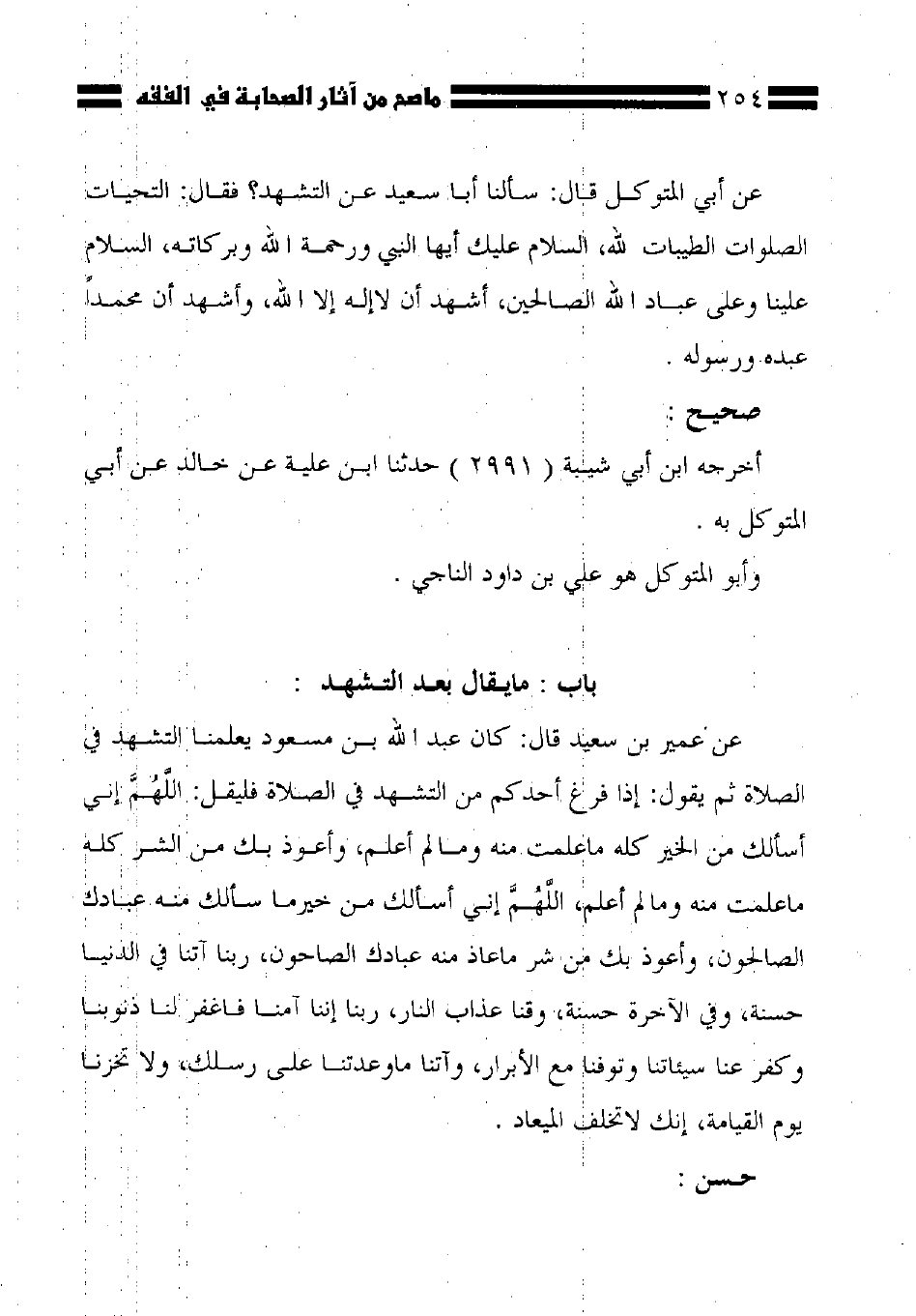 عن عمير بن سعيد قال: كان عبد الله بن مسعود يعلمنا التشهد في الصلاة تم يقول: إذا فرغ أحدكم من التشهد في الصلاة فليقل: اللَّهُمَّ إني أسألك من الخير كله ما علمت منه وما لم أعلم، وأعوذ بك من الشر كله ما علمت منه وما لم أعلم، اللَّهُمَّ إني أسألك من خير ما سألك منه عبادك الصالحون، وأعوذ بك من شر ما عاذ منه عبادك الصاحون، ربنا آتنا في الدنيا حسنة، وفي الآخرة حسنة، وقنا عذاب النار، ربنا إننا آمنا فاغفر لنا ذنوبنا وكفر عنا سيئاتنا وتوفنا مع الأبرار، وآتنا ما وعدتنا على رسلك، ولا تخزنا يوم القيامة، إنك لا تخلف الميعاد.