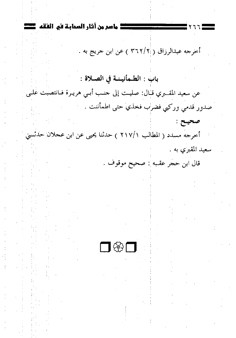 عن سعيد المقبري قال: صليت إلى جنب أبي هريرة فانتصبت على صدور قدمي وركبي فضرب فخذي حتى اطمأننت.
