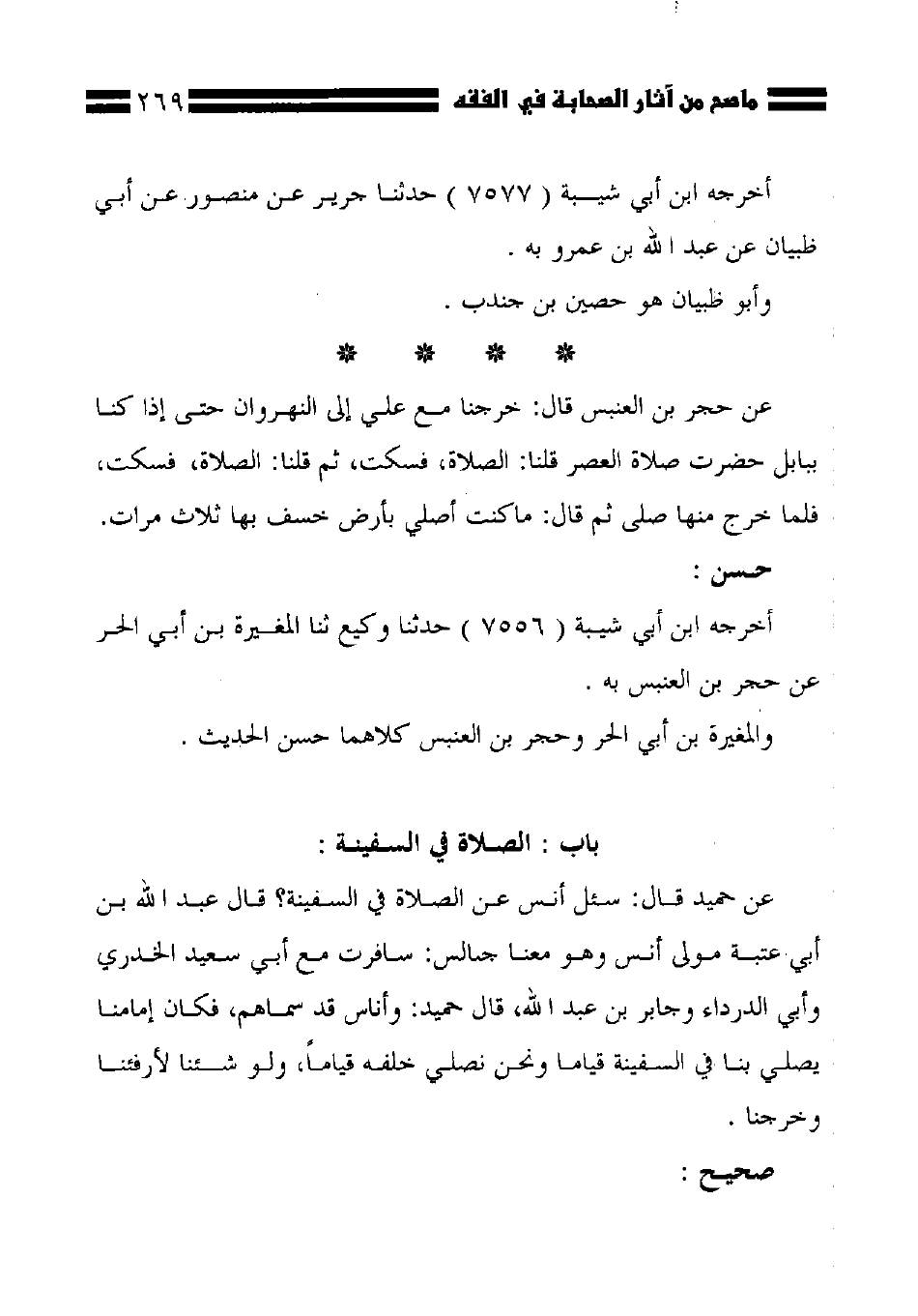 عن حميد قال: سئل أنس عن الصلاة في السفينة؟ قال عبد الله بن أبي عتبة مولى أنس وهو معنا جالس: سافرت مع أبي سعيد الخدري وأبي الدرداء وجابر بن عبد الله، قال حميد: وأناس قد سماهم، فكان إمامنا يصلي بنا في السفينة قياما ونحن نصلي خلفه قيامًا، ولو شئنا لأرفئنا وخرجنا.