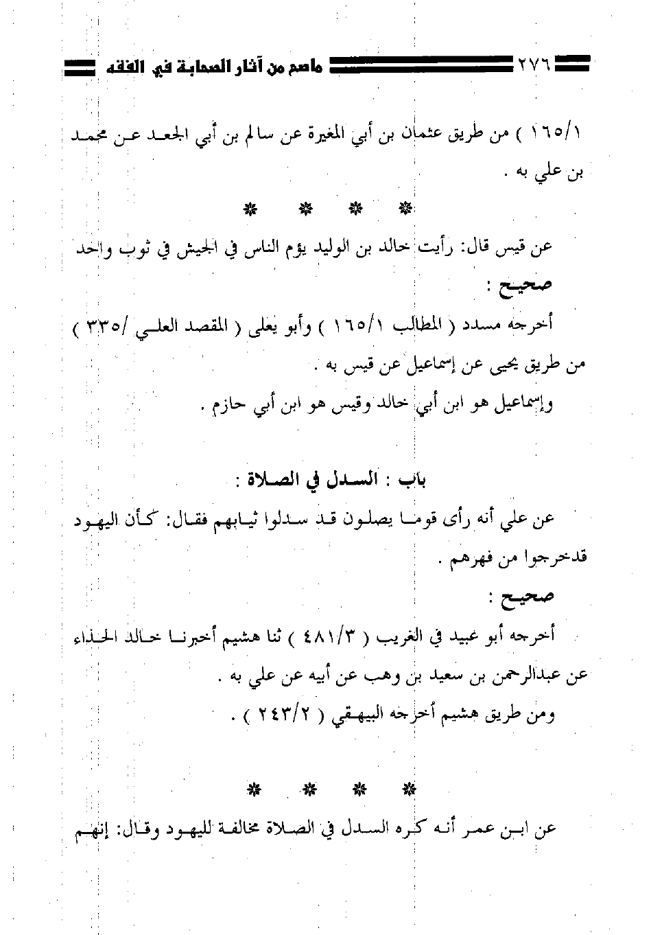 عن علي أنه رأى قوما يصلون قد سدلوا ثيابهم فقال: كأن اليهود قد خرجوا من فهرهم.