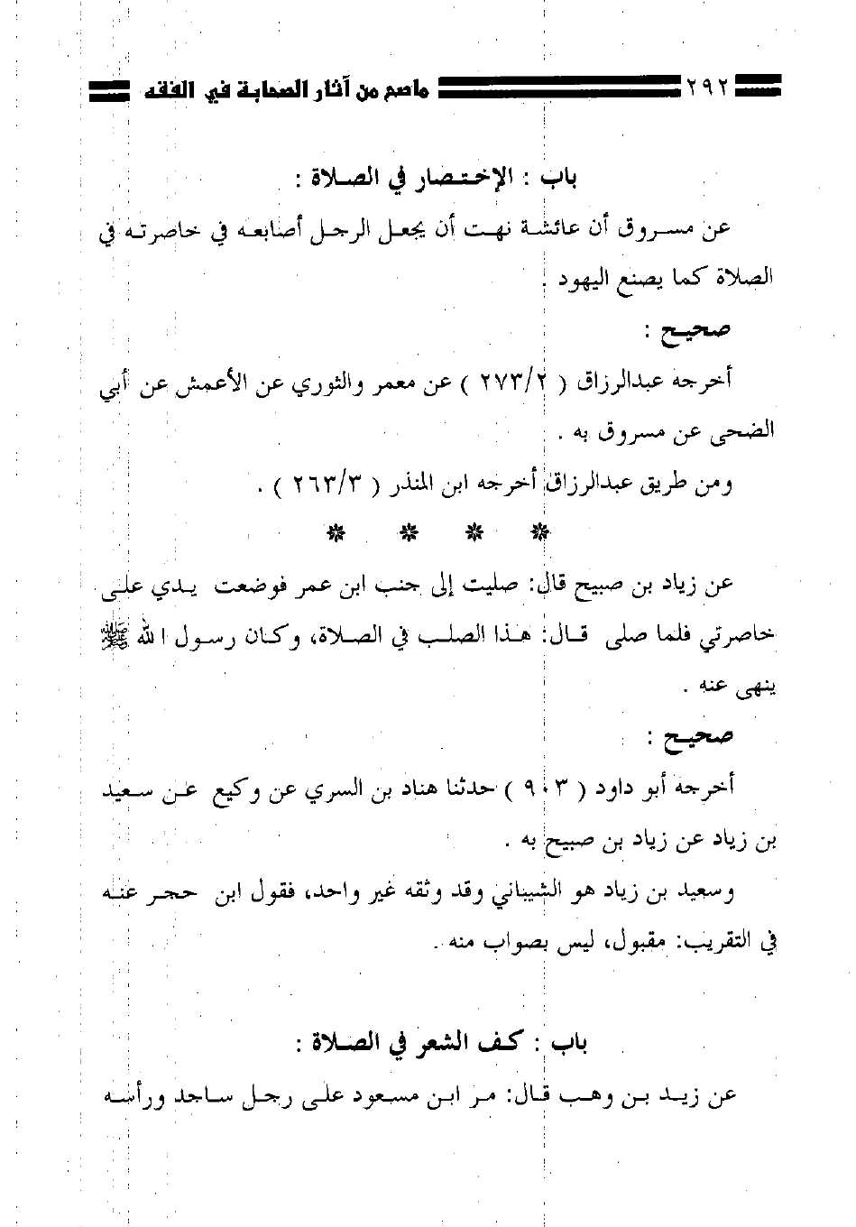 عن زياد بن صبيح قال: صليت إلى جنب ابن عمر فوضعت يدي على خاصرتى فلما صلى فال: هذا الصلب في الصلاة، وكان رسول الله - صلى الله عليه وسلم - ينهى عنه.